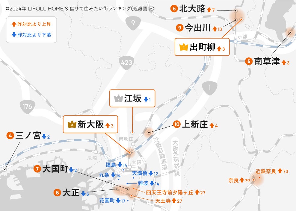 過去10年近く「江坂」と「三ノ宮」の“2強争い”が続いていましたが、そこに「出町柳」が新たにトップ争いに参入したことになります。ただし、2位「江坂」と3位「新大阪」は、広域ではほぼ同じエリアであり(間の「東三国」も14位)、近畿圏で最も借りて住みたいというニーズが集まっているエリアは「江坂」~「新大阪」周辺という状況が続いています。