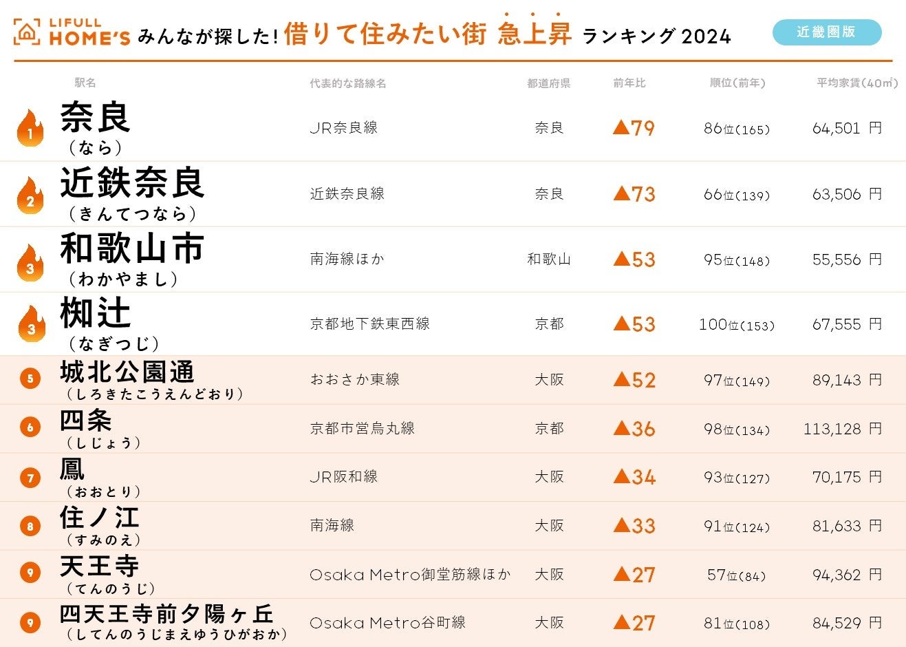 また最もランクが急上昇したのは79ランクアップの「奈良」(165位→86位)と73ランクアップの「近鉄奈良」(139位→66位)です。2駅は1㎞程度離れていますが、いずれも大阪中心部へのアクセスが乗り換えなしで30分超と交通利便性が良好で、賃料相場が6万円台であることも大きな魅力です。便利な割に賃料が安価なことは、物価上昇の折、特に近畿圏では強く意識される物件選択の傾向です。