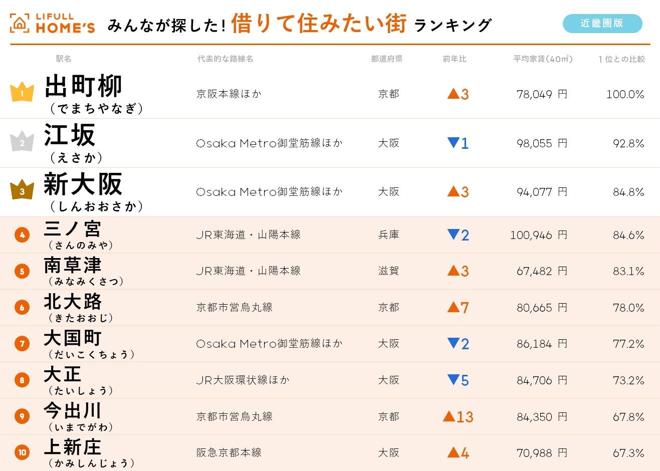「出町柳」が「江坂」を僅差で逆転し初のトップに!京都市内の駅が1位になったのも初。