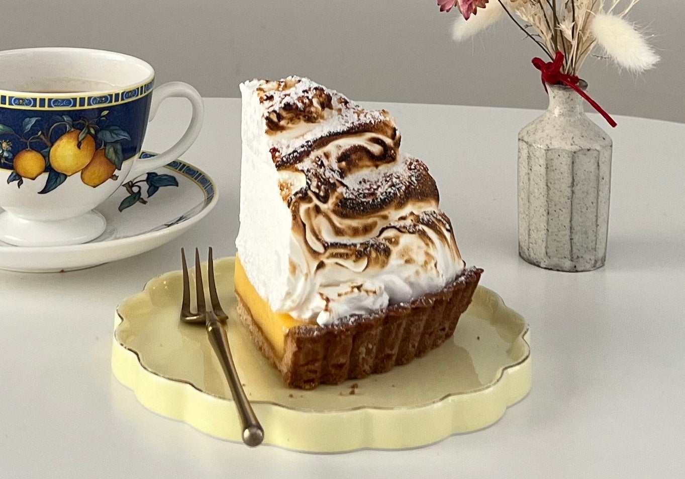アーモンドを入れた風味豊かなタルト生地にフルーティーな洋酒がアクセントのレモンカードを敷き、華やかな絞りのメレンゲで仕上げた、甘酸っぱい美味しさが口いっぱいに広がるレモンタルトです。