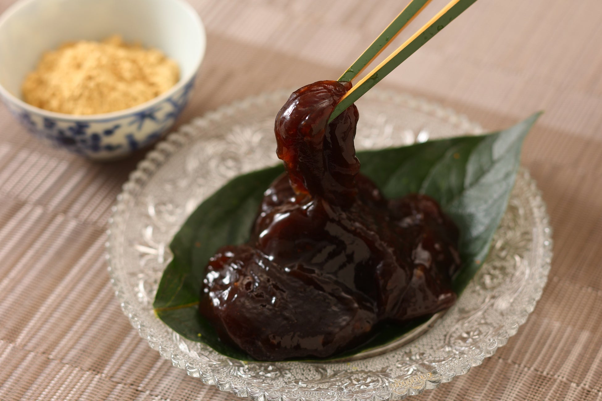 国産の本わらび粉だけを練って作られた、わらび粉本来の色と香り、なめらかで粘りのある食感が特徴のわらび餅。最初はそのまま一口、そのあと黒蜜、きな粉をたっぷりとかけてお召し上がりください。