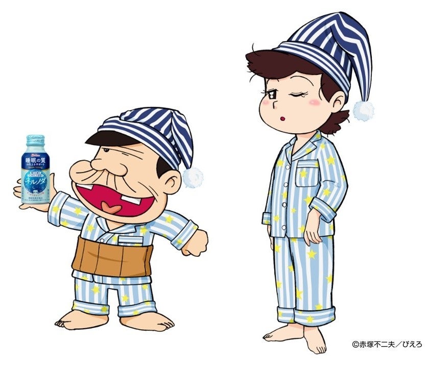 左から、描き下ろしイラストを使用したキャンペーンビジュアル、「ネルノダ」パジャマを着用したバカボンのパパとママの描き下ろしイラスト
