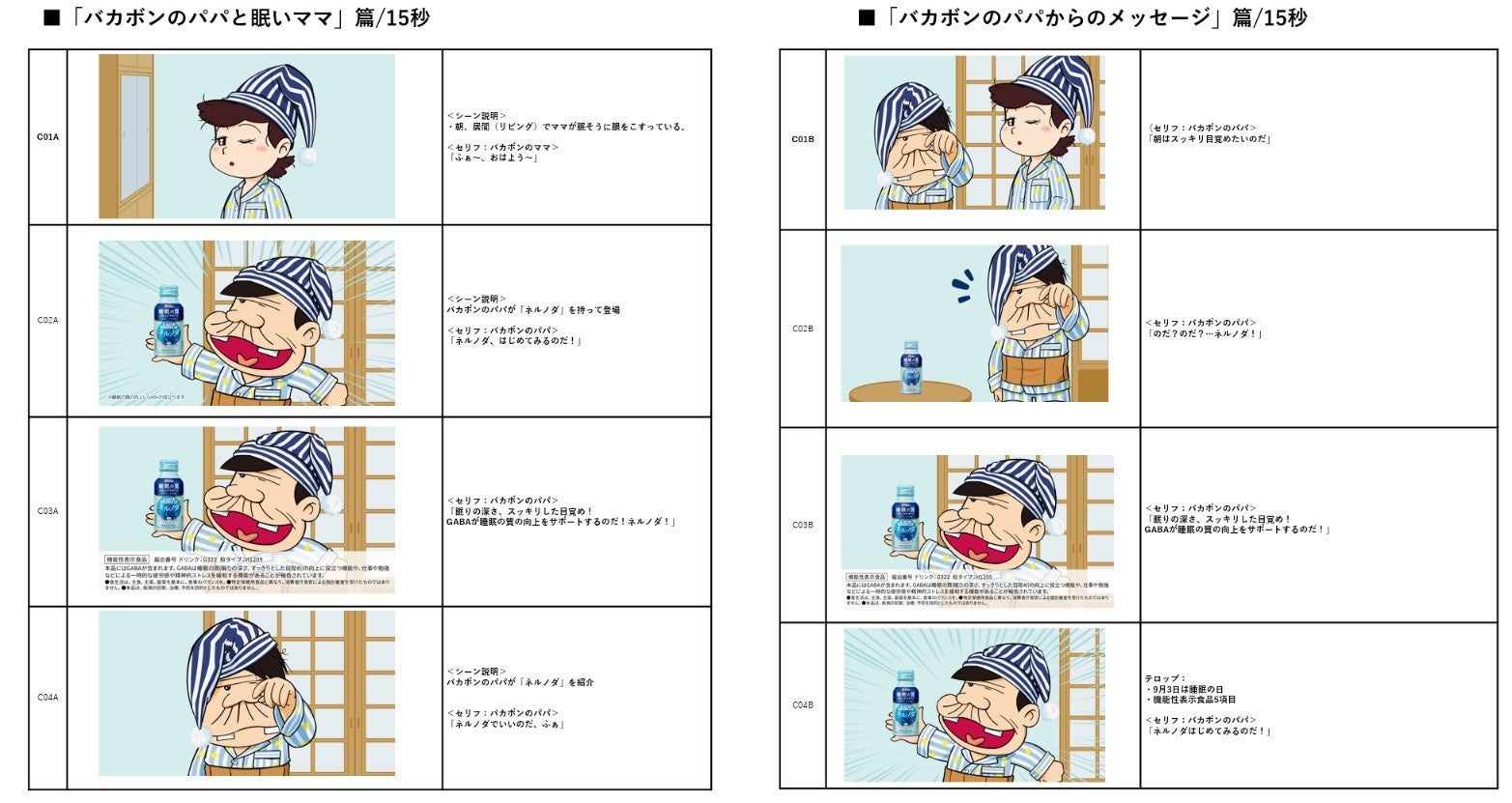 キャンペーンビジュアルには、「ネルノダ」のパッケージのような色のパジャマを着用しているバカボンのパパが、「ネルノダ」を持っている描き下ろしイラストを採用。キャンペーン特設サイトでは、『天才バカボン』のオリジナル4コマ漫画や動画も楽しめます。