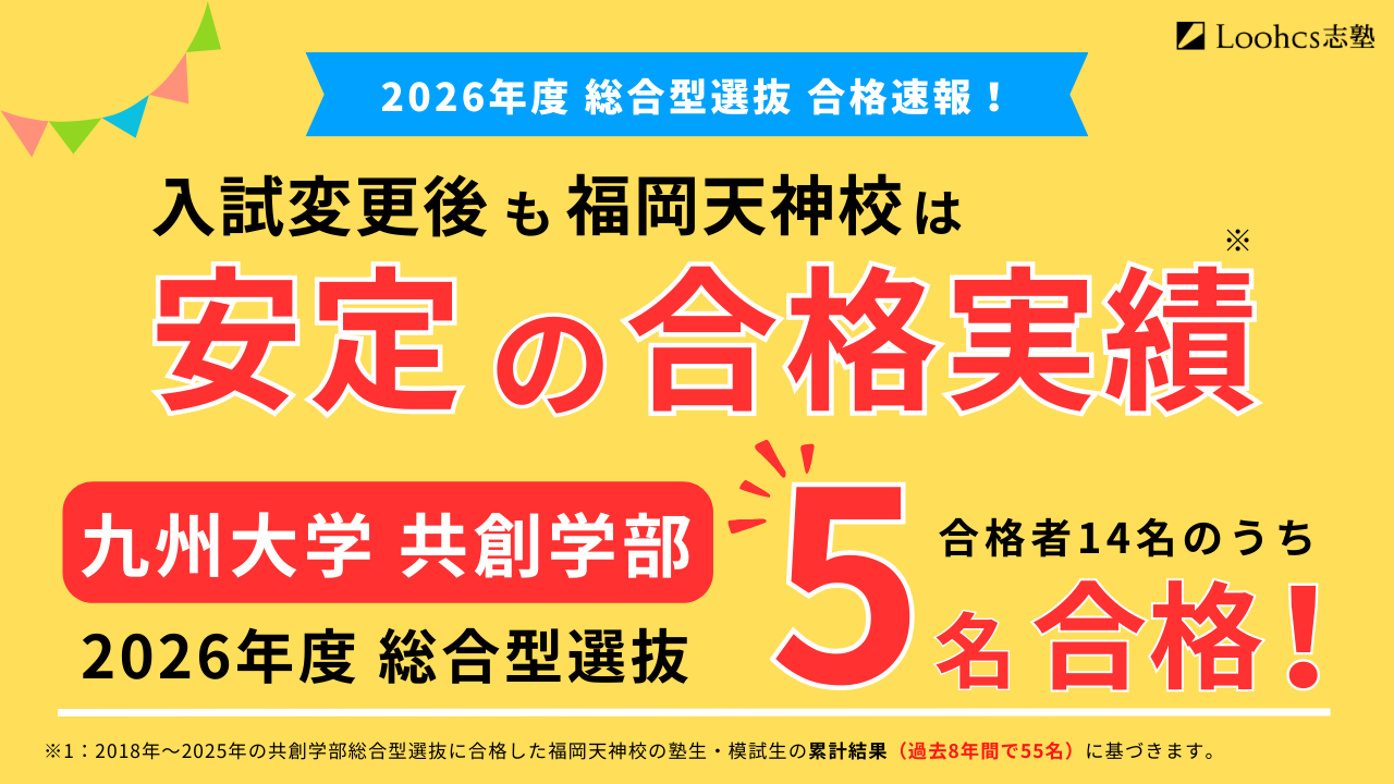 こうした厳しい環境の中、Loohcs志塾福岡天神校では、2026年度入試における九州大学共創学部(総合型選抜)の合格者のうち、同校主催の共創模試受験者から5名の合格者を輩出しました。