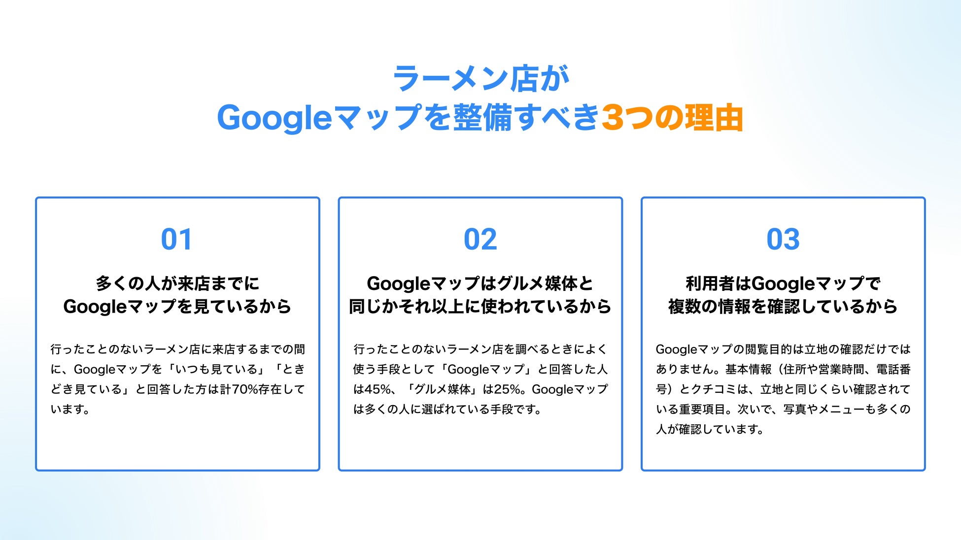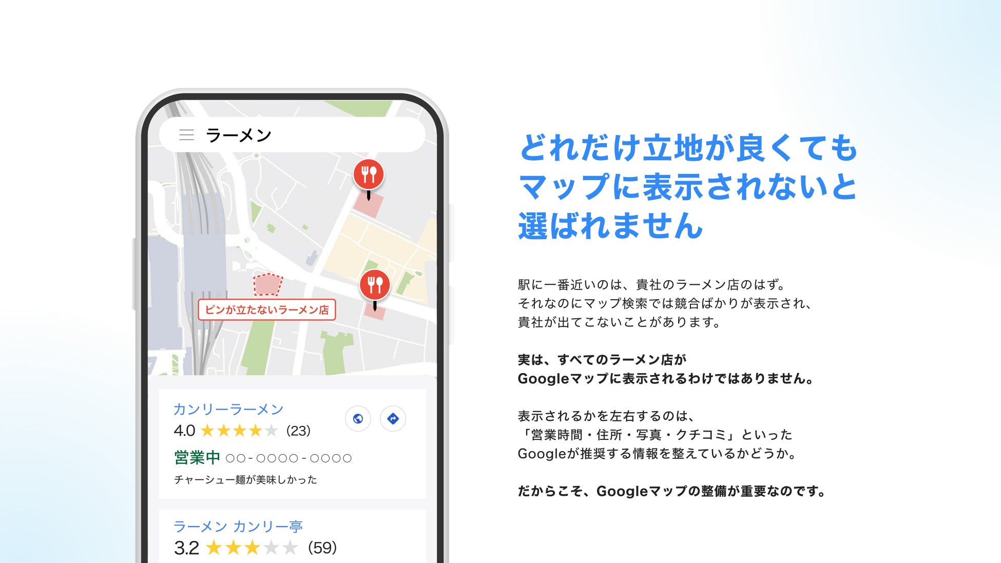 近年、お客様の行動は大きく変化しており、今やGoogleマップがラーメン店を探すための”主戦場”となっています。