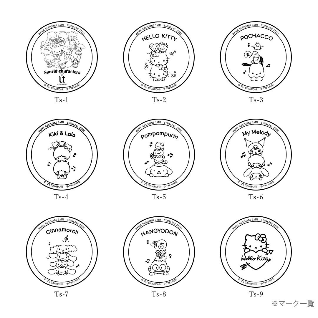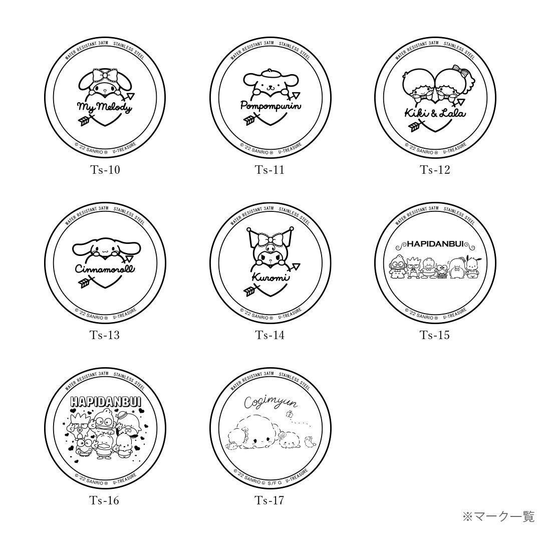■選べるキャラクターマーク17種類:サンリオキャラクターズ1種類、ハローキティ2種類、ポチャッコ1種類、リトルツインスターズ2種類、ポムポムプリン2種類、マイメロディ2種類、シナモロール2種類、ハンギョドン1種類、クロミ1種類、はぴだんぶい2種類、こぎみゅん1種類