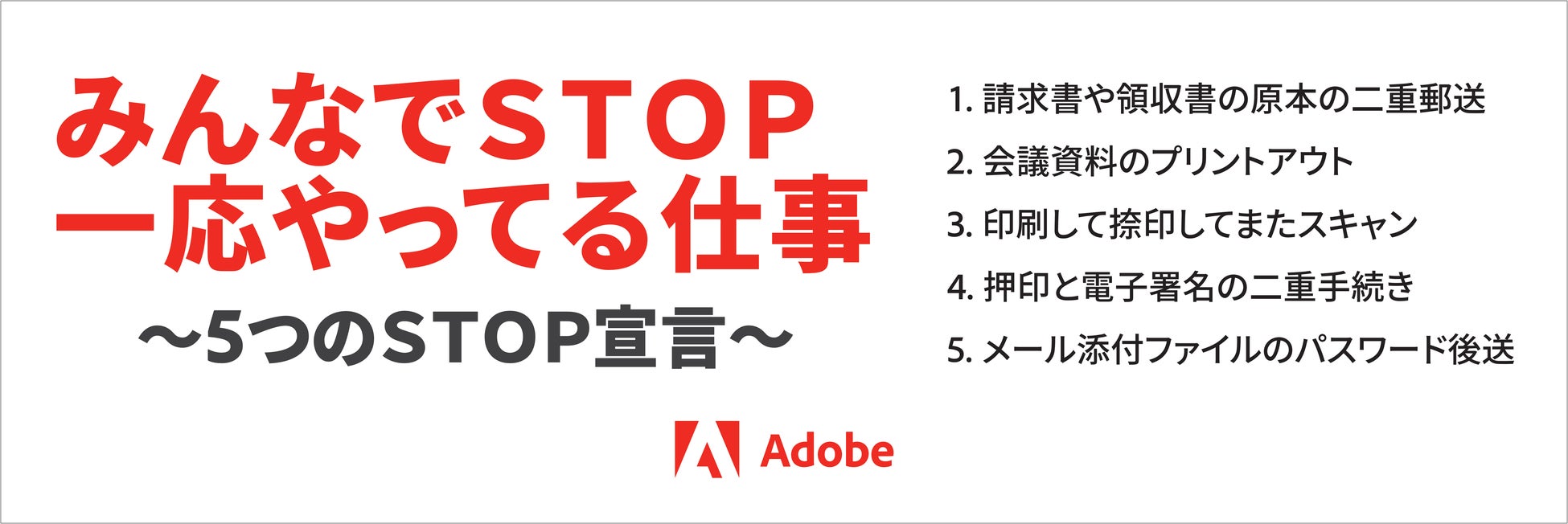 そこでアドビでは、「みんなでSTOP 一応やってる仕事~5つのSTOP宣言~」というスローガンを新たに掲げました。ビジネスパーソンだけでなく、会社、上長、顧客なども巻き込んでAdobe AcrobatやPDFなどを活用しながら、デスクワーカーにとって働きやすい未来を創っていくためのスローガンです。