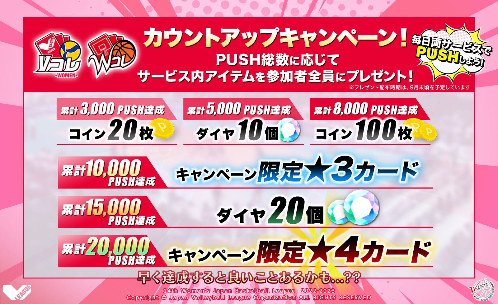 Vコレ-WOMEN-はV.LEAGUEに所属する女子バレーボール選手の、WコレはW LEAGUEに所属する女子バスケットボール選手の、それぞれのリーグでの試合中のプレーシーンを中心としたデジタルトレーディングカードを無料で集めることができるサービスです。今回は10月に両リーグの新シーズンが開幕することを記念し、Vコレ-WOMEN-とWコレでコラボレーションを行い、両サービスのユーザーが共に楽しめる企画をご用意いたしました。