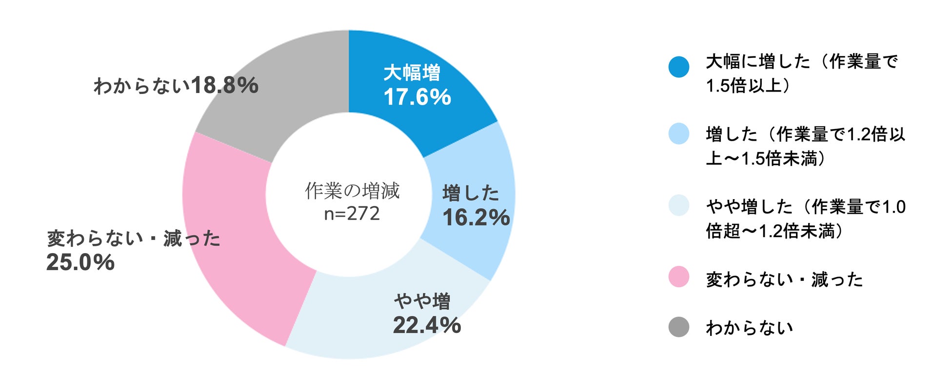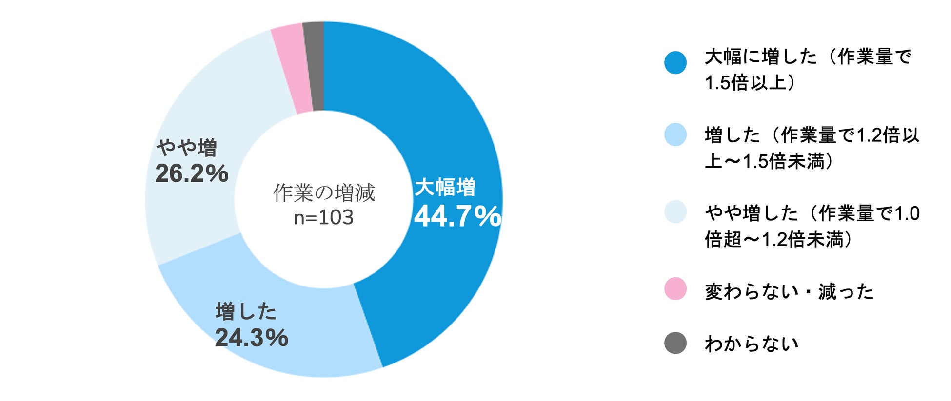 税理士にインボイス導入後に業務量が増えたかどうか尋ねると、ほぼ全ての税理士が「増した」と答えました。「増した」と回答した中でも、大幅増(1.5倍以上)が最も多く46名(44.7%)で、「1.2倍〜1.5倍」が25名(24.3%)、「1.0倍〜1.2倍」が27名(26.2%)でした。内訳を聞くと「領収書の確認」「請求書の確認」「記帳代行業務(記帳業務、仕訳の確認)」との回答が多く、主に「細かい作業」が増えた実態が明らかになりました。