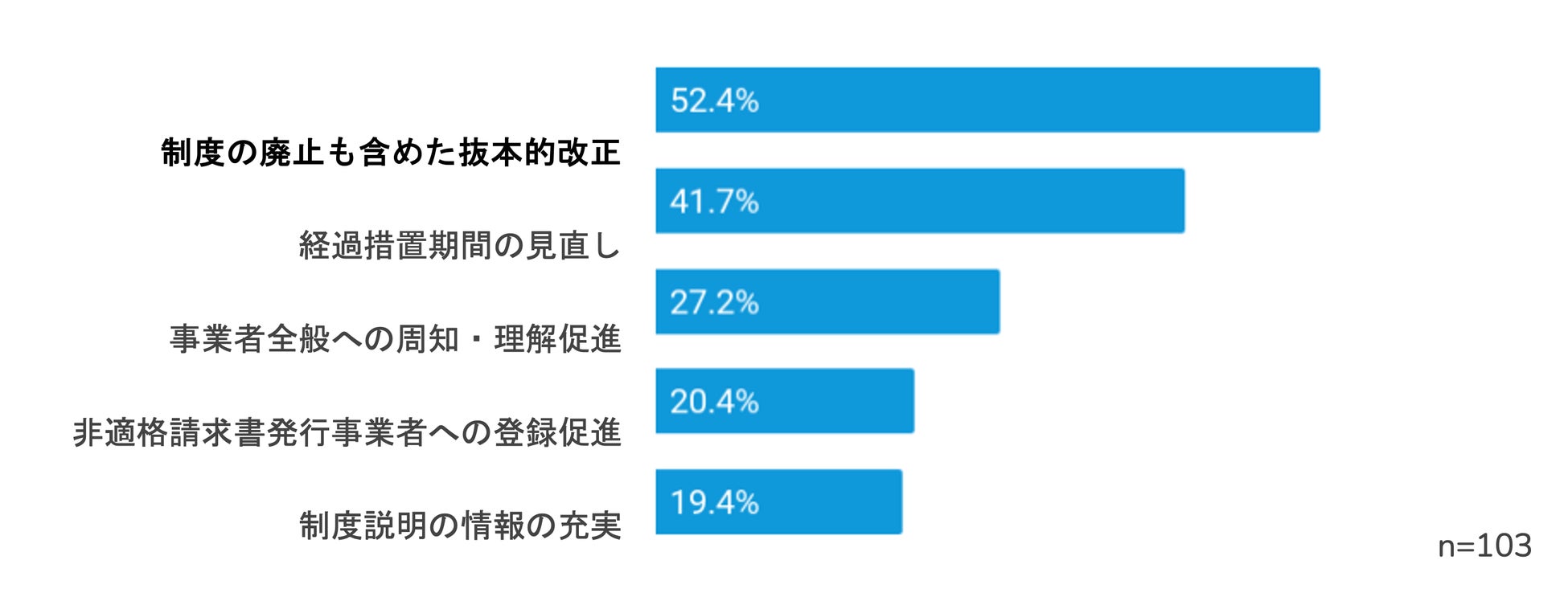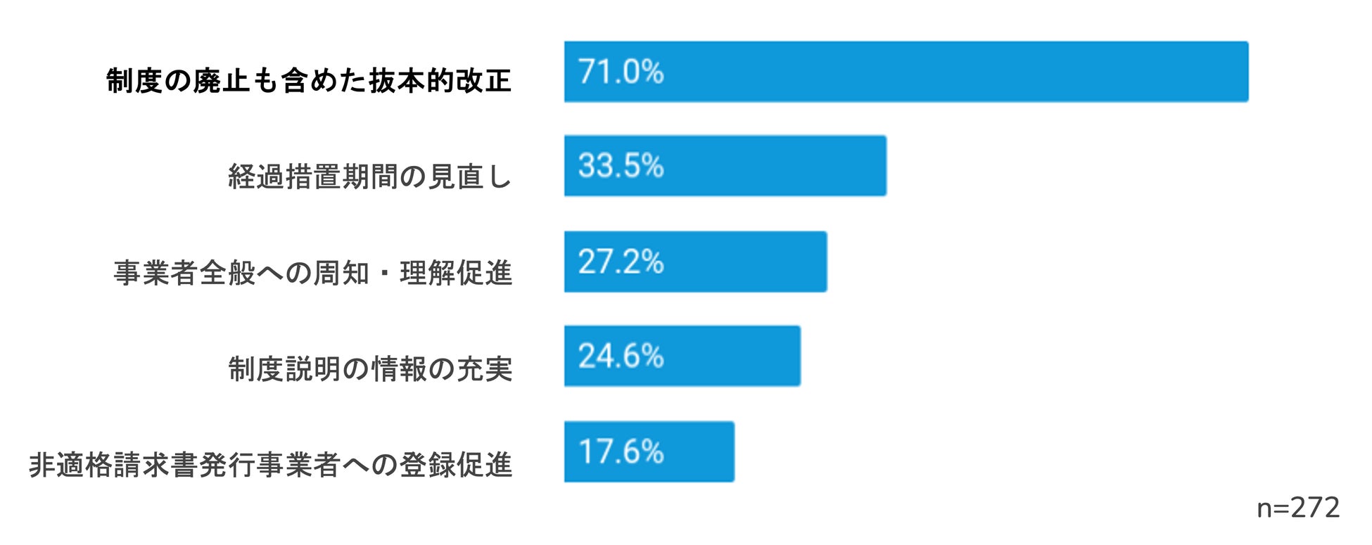 制度開始当初から混乱が予想されていたインボイス制度ですが、いまだ浸透していない実態が見えてきました。税理士、ユーザー共に「インボイス制度について、行政が取り組むべきこと」について複数回答で聞いたところ、いずれも税理士の54名(52.4%)、ユーザーの193名(71.0%)が「制度の廃止も含めた抜本的改正」を求める声がトップとなりました。ユーザー側からは「なぜ税理士が反対しないのか疑問」「悪質な税制には税理士に対抗してほしい」など、税の専門家によるアクションに期待する声もありました。