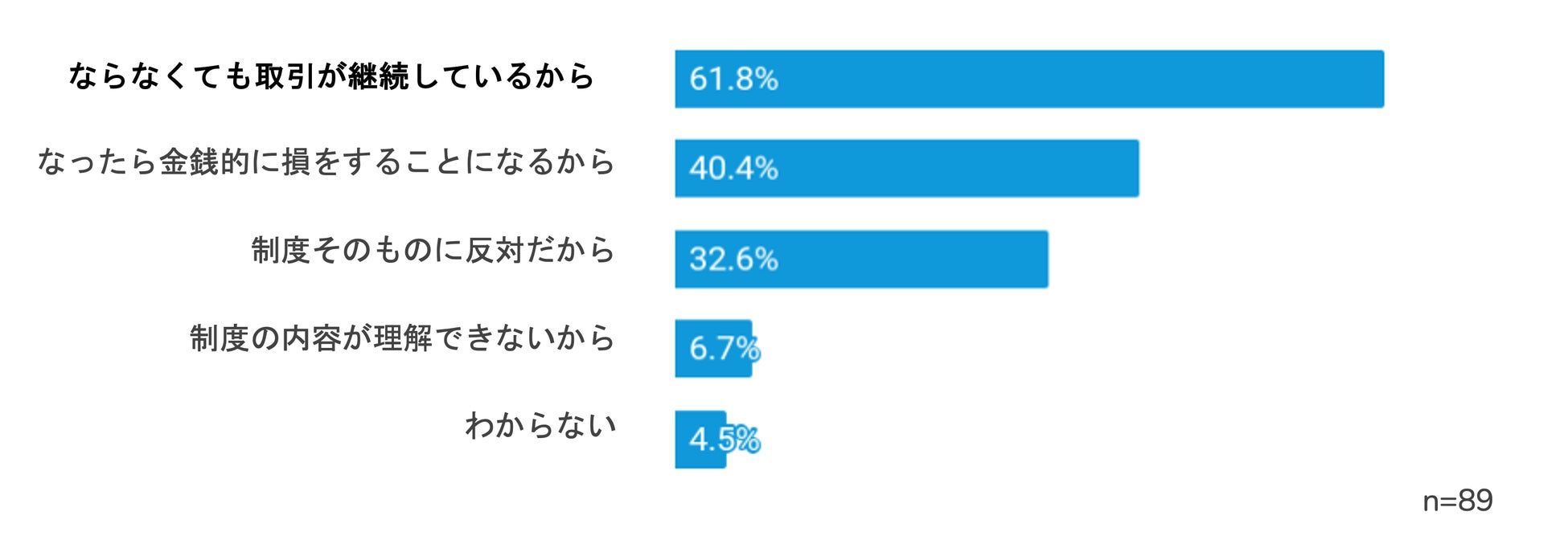 なぜ登録しないかを複数回答で尋ねると、多い順に「ならなくても取引が継続しているから」が55名(61.8%)「金銭的に損をすることになるから」36名(40.4%)「制度そのものに反対だから」29名(32.6%)となっています。実害がないということが登録をしない理由になっているようです。