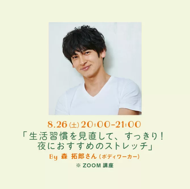 8月26日(土)20:00~21:00 「生活習慣を見直して、すっきり!夜におすすめのストレッチ」