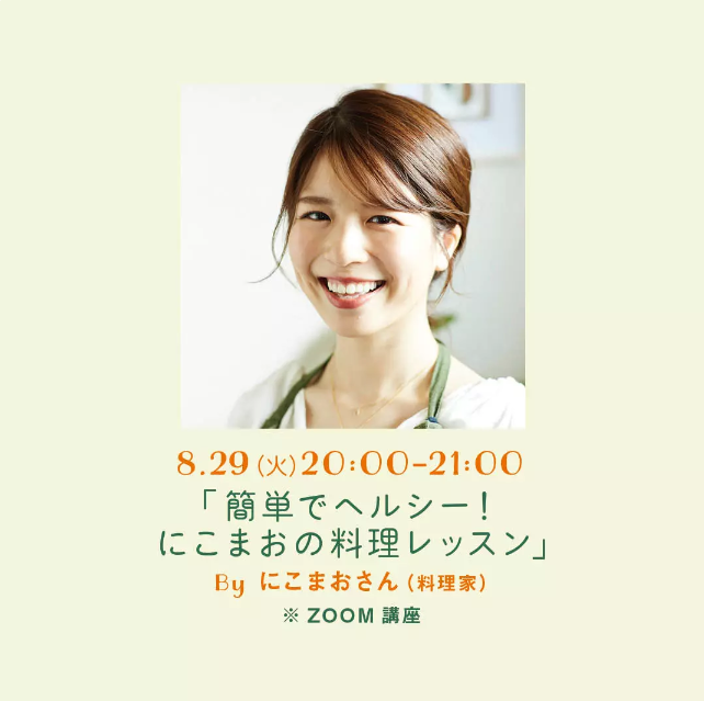 8月29日(火)20:00~21:00「簡単でヘルシー!にこまおの料理レッスン」