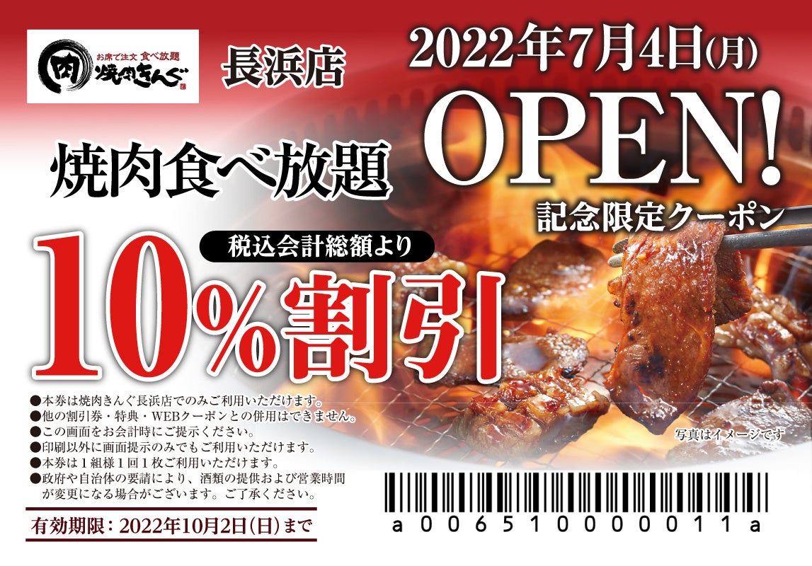 オープンを記念して、『焼肉きんぐ 長浜店』でご利用いただけるwebクーポンを配布いたします。