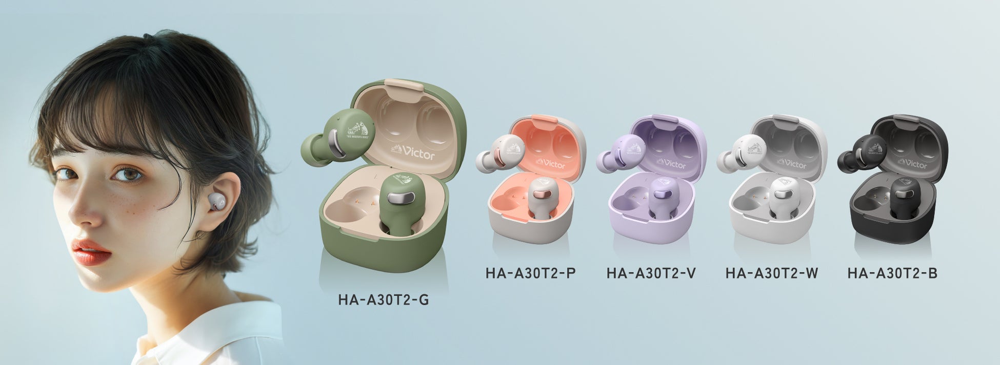屋外使用時などで発生しやすい風切り音を抑制するフードとなる、メタリックパーツをワンポイントに使ったバイカラーデザインを採用。カラーバリエーションは、トレンドを意識したニュアンスカラー5色(グリーン・ピンク・パープル・ホワイト・ブラック)をラインアップします。また、イヤホン本体と充電ケースには、Victorブランドの象徴である「犬のマーク」をデザインしています。