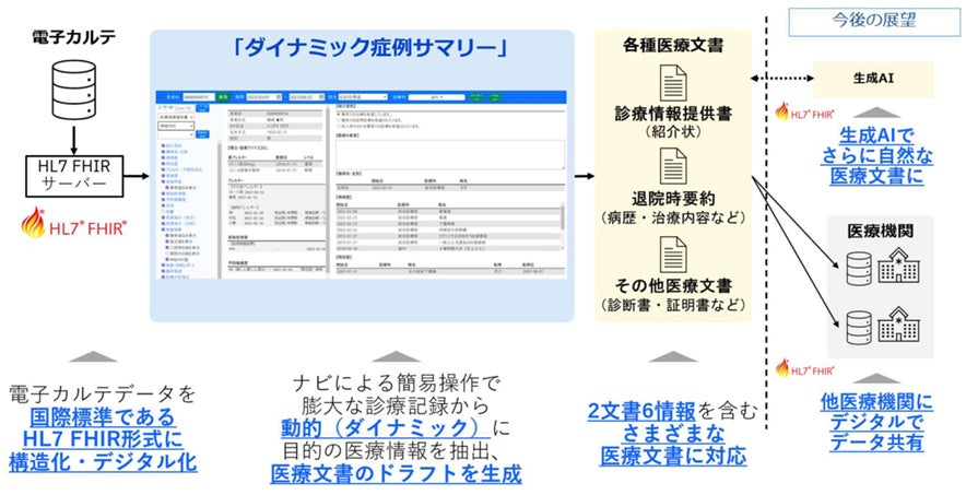 「ダイナミック症例サマリー」は、最新の電子カルテシステム情報から、診療情報提供書(紹介状)や退院時要約、各種診断書、証明書といったさまざまな医療文書の要素を、HL7® FHIR1®(以下 HL7 FHIR)に対応した「FHIR リソース」ごとに適切な条件で抽出し、動的(ダイナミック)に組み合わせることで、さまざまな医療文書のドラフト作成を支援するシステムです。