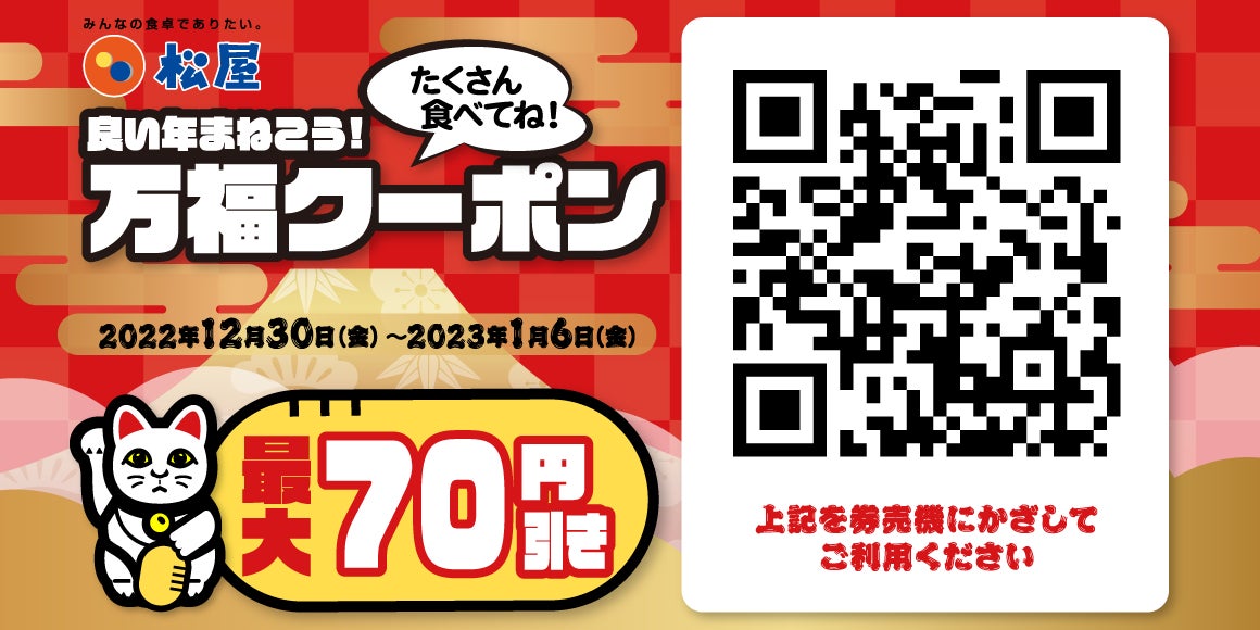 | クーポン名 万福クーポン 利用可能期間 2022年12月30日(金)0時 ~ 2023年1月6日(金)23時59分 ※お店での購入のみ対象です。松弁ネット、松屋モバイルオーダー等は対象外です。 |