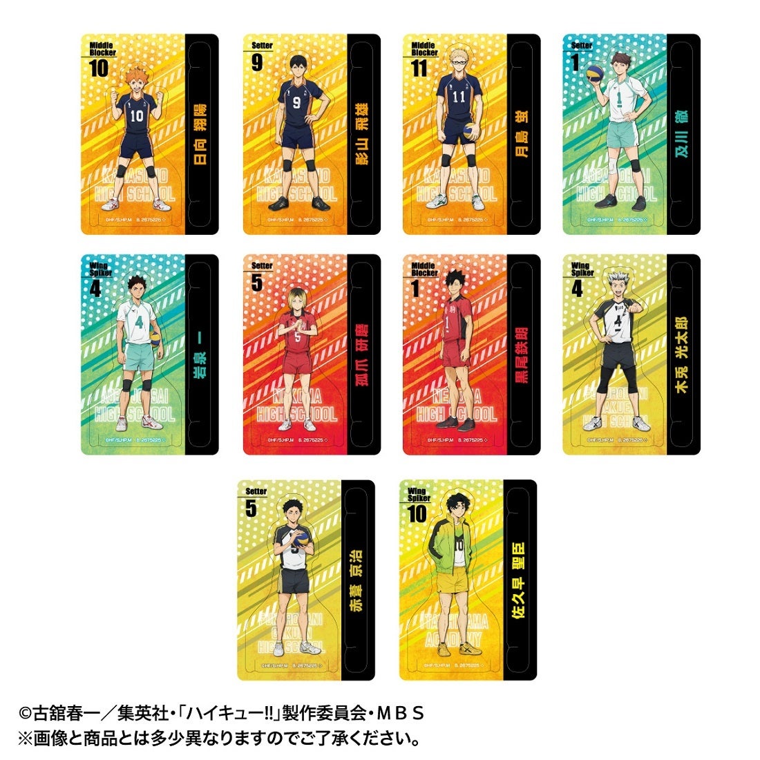 身長差を再現したラインナップです。背景にはキャラクター名称のほか、選手たちのポジション名の記載も。集めて並べたくなるデザインです。