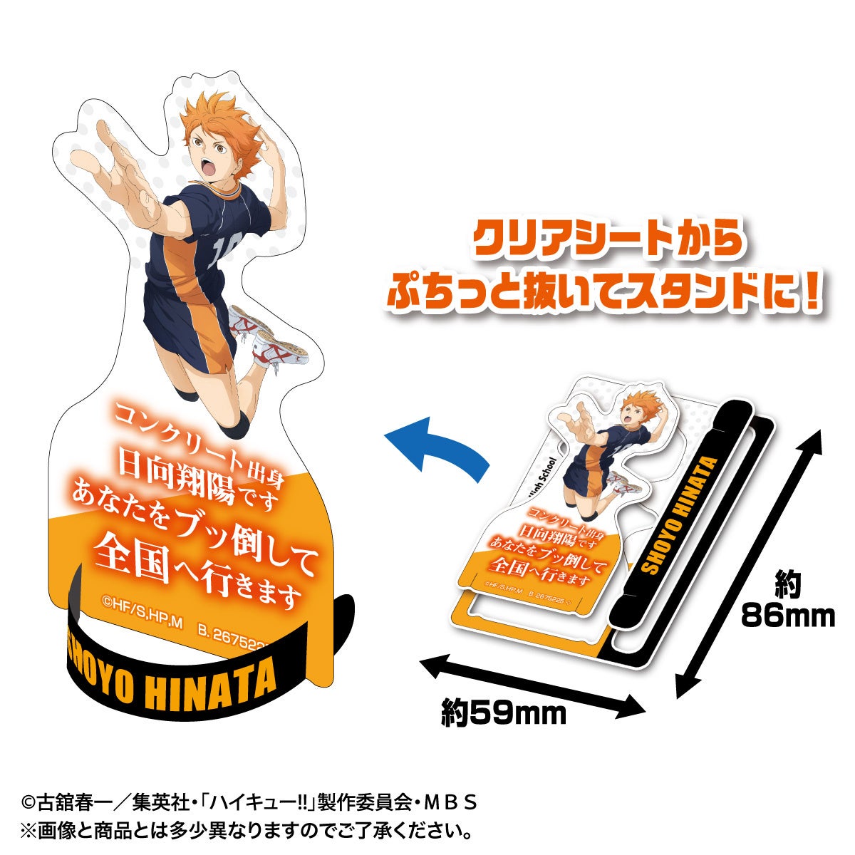 クリアシートからぷちっと抜いてスタンドさせてディスプレイに!組み立てて飾ることもできる新しいコレクションアイテムです。ラインナップは全29種。アニメ「ハイキュー‼」に登場する人気キャラクター達の<等身ビジュアルデザイン>14種と、<描き下ろしセリフ入りデザイン>10種、<描き下ろしペアデザイン>5種があり、