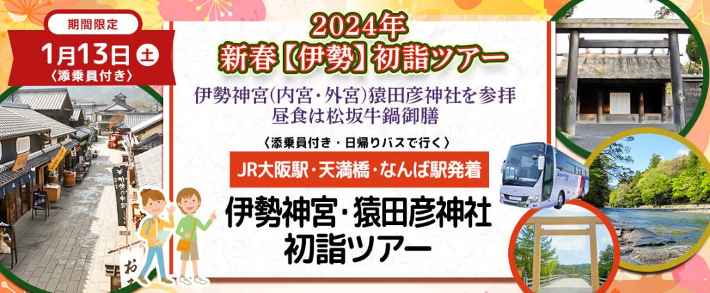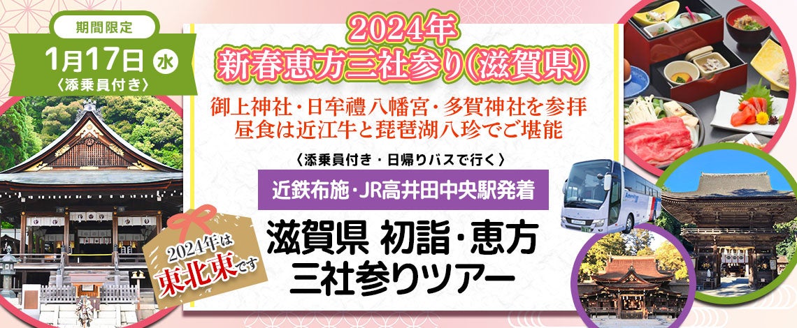 新春企画「初詣・お参りスポット」特集〈大阪駅・天満橋・なんば発着・添乗員付き〉 新コース登場!! 人気の「京都」・伊勢神宮」2024年の恵方は「東北東」滋賀県の厳選の参拝スポット日帰りバスツアーのオンライン販売を開始しました。