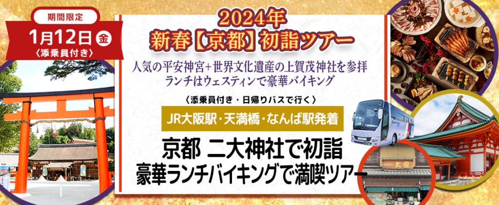 増席しました。おひとり様11,800円 1月12日(金) 【京都】〈大阪駅・天満橋・なんば発着・添乗員付き〉2024年新春【京都】初詣!世界遺産「上賀茂神社」・人気初詣スポット「平安神宮」を参拝+ウェスティン京都でのランチブッフ+老舗つけもの店でのお買い物 日帰りバスツアーのオンライン販売を開始しました。