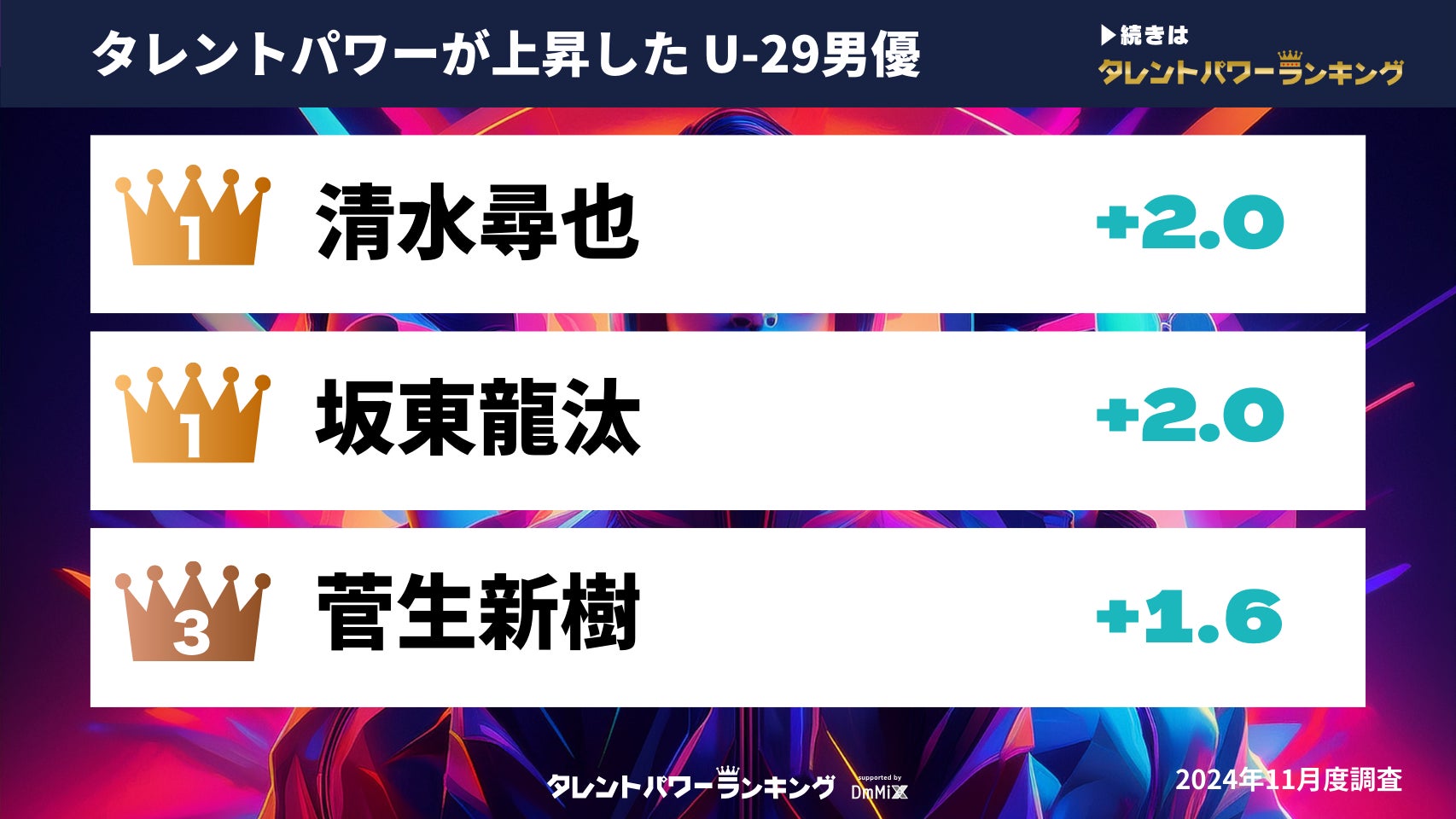 『タレントパワーランキング』では、2024年8月調査と2024年11月調査の間で、パワースコアが最も上昇した29歳以下の男優・女優に焦点を当て、ランキング形式にまとめました。