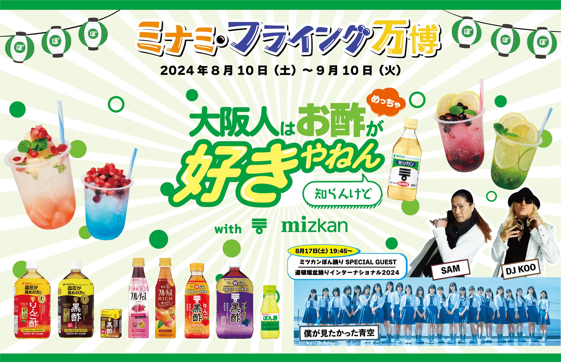 株式会社Mizkan(本社:愛知県半田市、代表取締役兼CEO:吉永智征、以下ミツカン)は、なんば・道頓堀公共空間活用連絡会(会長:上山勝也、以下NDK連絡会)が2024年8月10日(土)~9月10日(火)に開催する「ミナミ・フライング万博 2024夏の陣 with ミツカン」へ協賛いたします。本イベントでは、「大阪人はめっちゃお酢が好きやねん。知らんけど」をテーマに、暑い夏にぴったりな「ミナミ・フライング万博酢ワー」や大阪名物とのコラボ企画などが行われます。