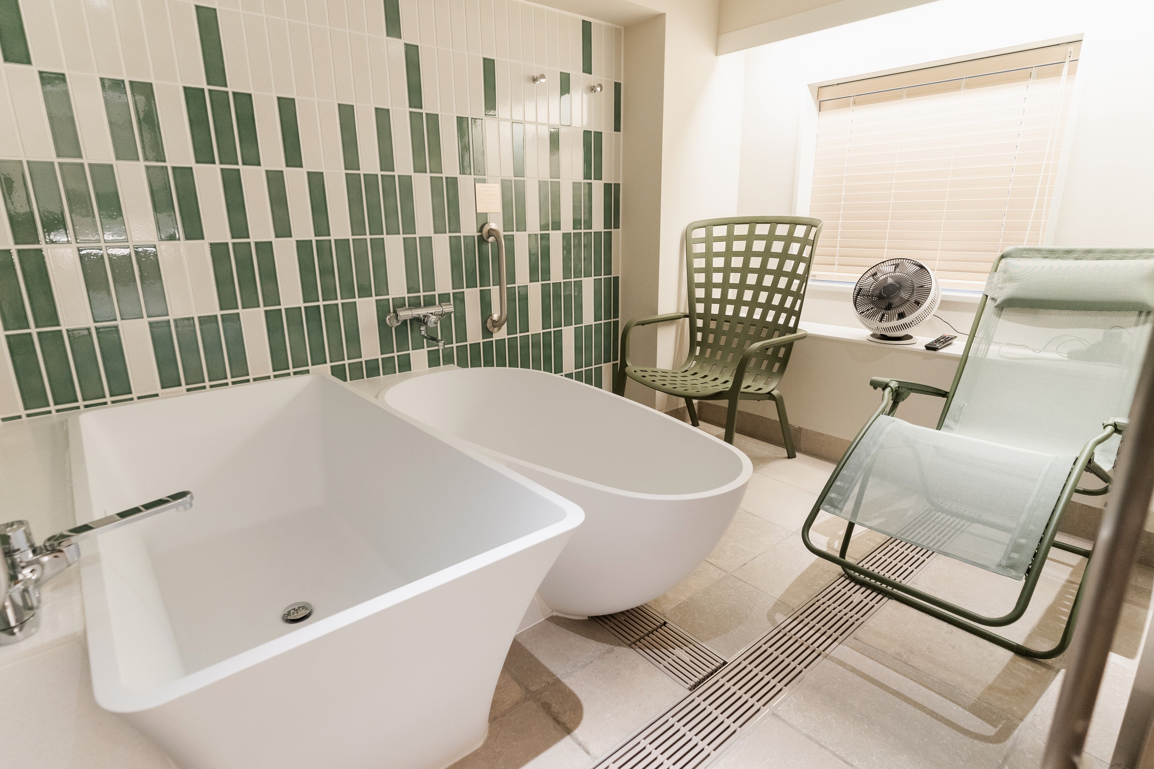水風呂は冷却装置により常時12℃に設定されており、しっかりと“ととのう”ことができる環境を整備。ととのいルームには、湯気が立ちのぼる様子をイメージした白と緑のタイルを使用し、視覚的にもリラックスできる空間に仕上げました。