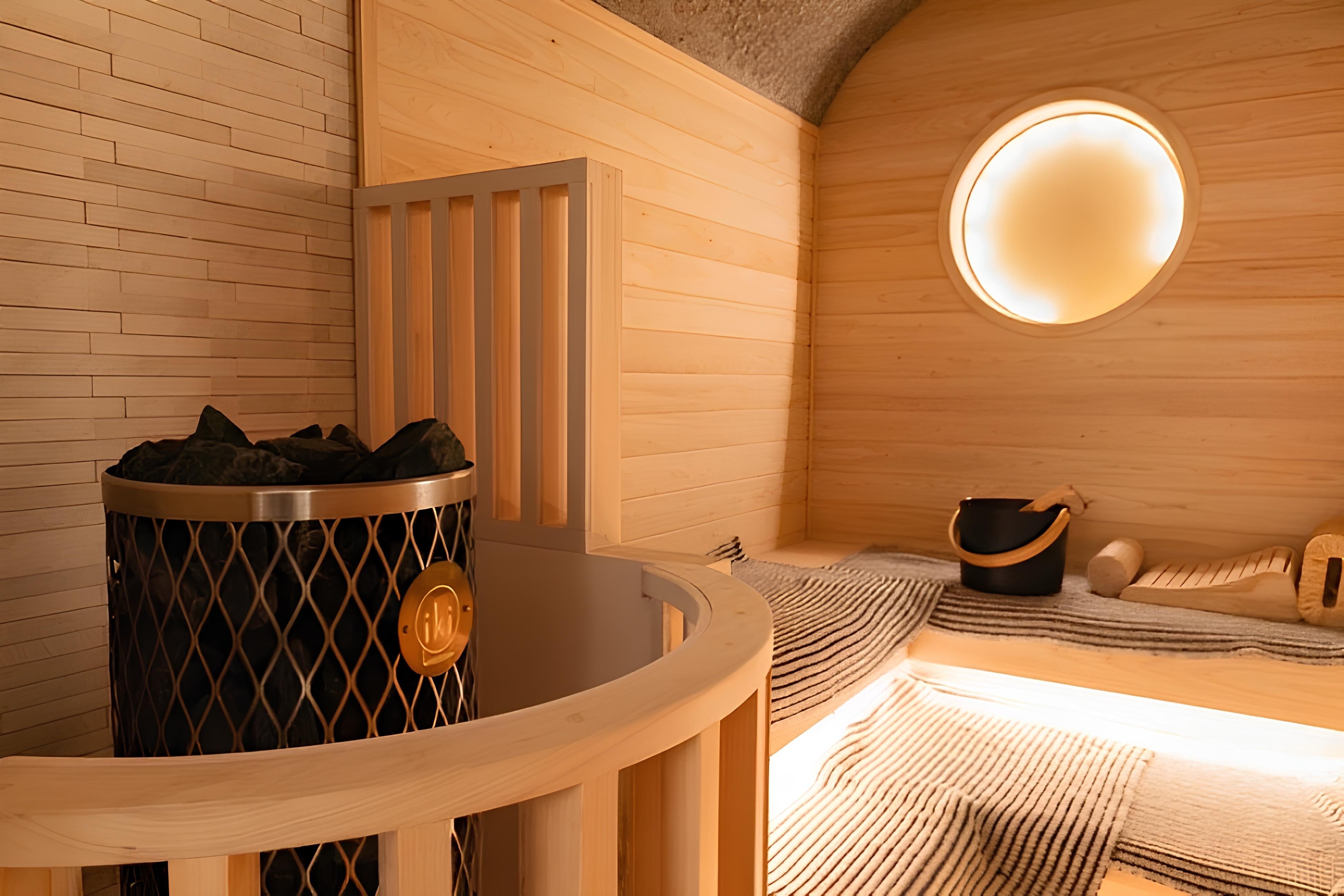 サウナには、本場フィンランドの伝統に基づいたメトス社取り扱いのサウナストーブ「iki」を採用。お好みの湿度や温度で、本格的なセルフロウリュを楽しみながら、自分だけの“ととのい”時間をお過ごしいただけます。また、サウナ室内の照明には月の満ち欠けをモチーフとした演出を施し、12分かけて徐々に点灯・消灯する仕組みによって、まるで砂時計のようにサウナの滞在時間を優しく知らせてくれます。背景には月面をイメージした凹凸をあしらい、視覚的にも幻想的な空間を演出しました。
