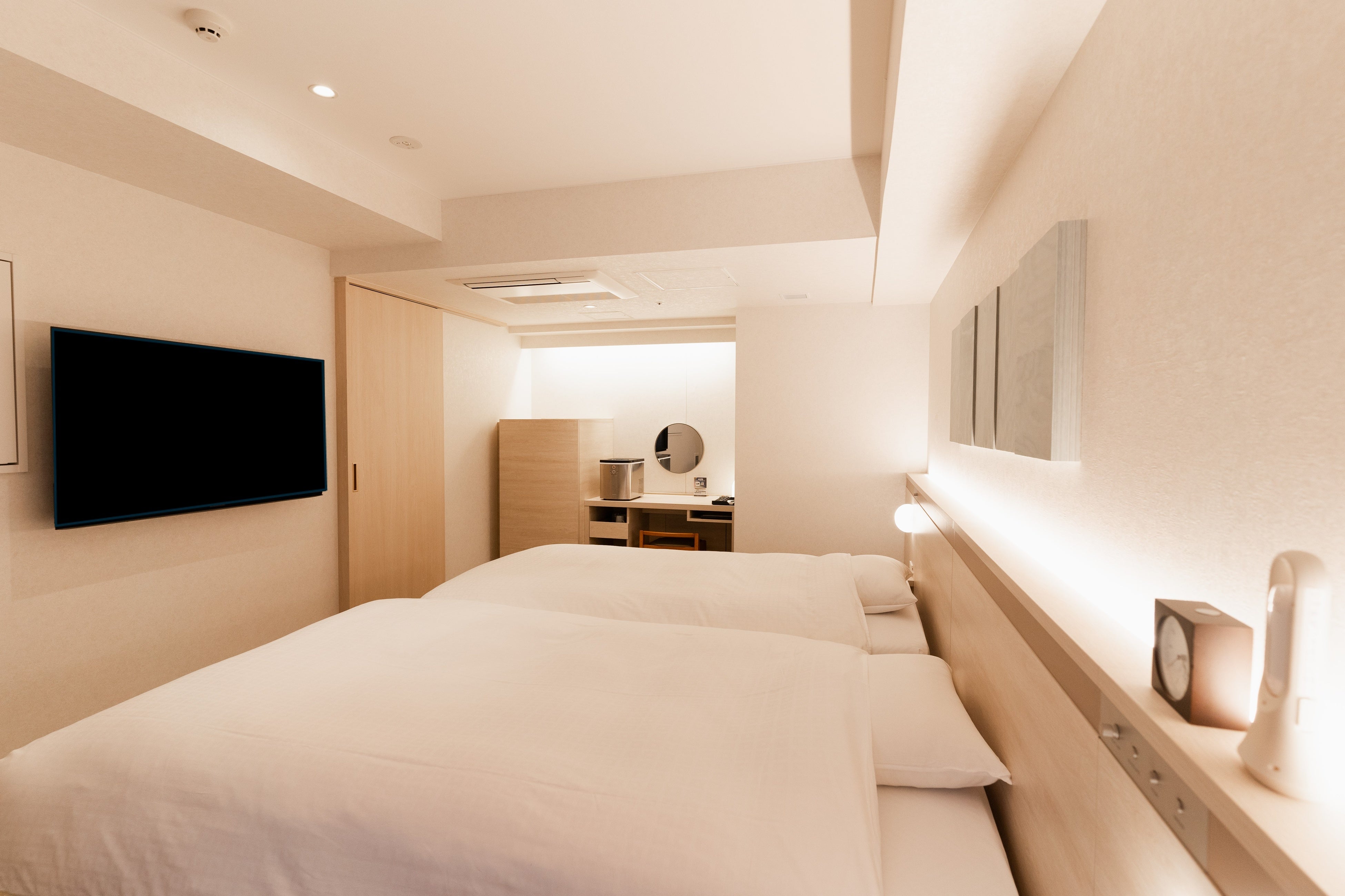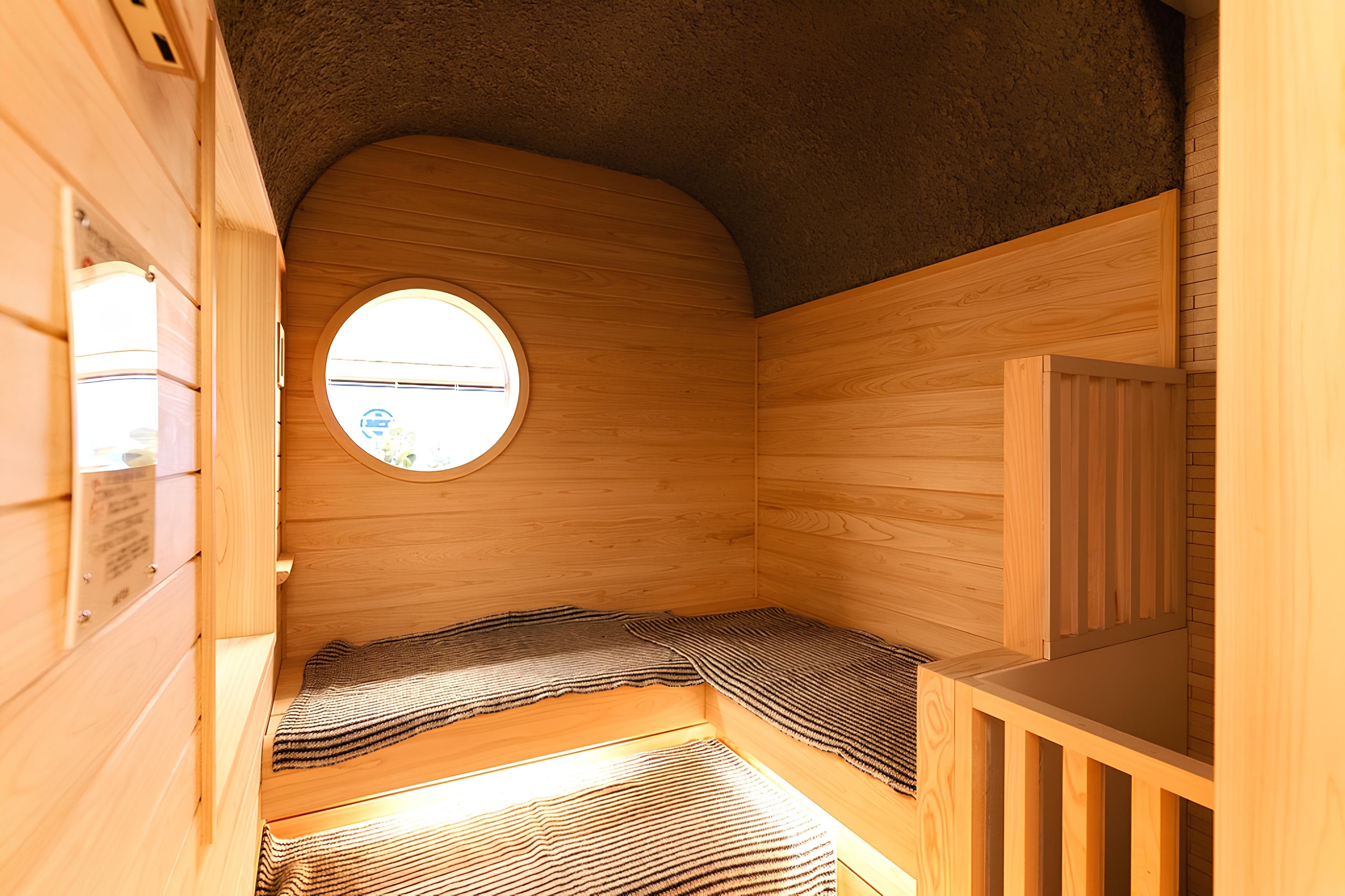 2名様でのご利用に最適な「Saunaツインルーム」は、寝転がれる広さのサウナとととのいスペースを備えた、ゆったりと過ごせる客室です。サウナには、温度を80℃・90℃・100℃から選べるダイヤル式温度調整機能を搭載しており、3時間で自動停止する安全設計。水風呂と湯船をそれぞれ1台ずつ備え、交互浴による本格的な“ととのい”体験をお楽しみいただけます。