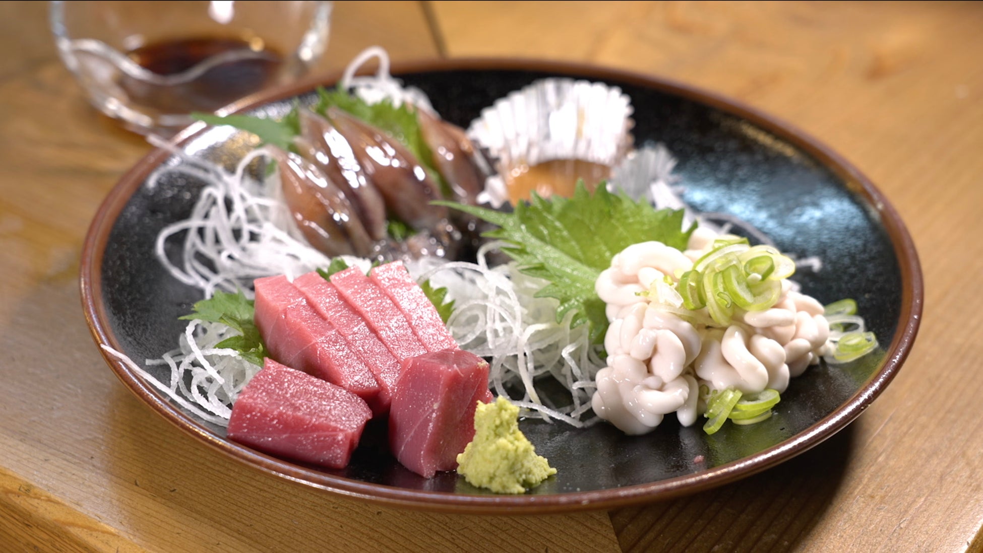 マキタスポーツは、賑わう店内のカウンターに席を構え、まずは生ビールとお通しで、今日の疲れを癒す。続いて味のある手書きの短冊から、惹かれた魚を選び、盛り合わせに。