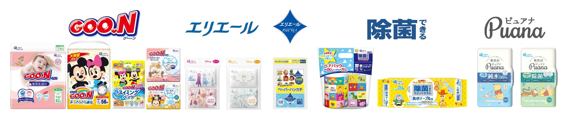 エリエールでは2020年10月、ベビー用紙おむつブランド「グーン」より、毎日のおむつ替えを楽しく感じてもらいたいという想いから、子どもから大人まで人気のミッキーマウス&ミニーマウスのデザインにリニューアル。多くのお客さまから“子どもとキャラクターの会話をしながらスムーズにおむつ替えができた”とのお声をいただき、好評を博しました。その後も、長引くコロナ禍のおうち時間を少しでも明るく過ごしていただきたいという想いを込め、除菌・ウエットやペーパータオル、ティシュー、ふき掃除シートなどの商品パッケージに、世界中で親しまれている『くまのプーさん』や『アナと雪の女王』、『リトルマーメイド』など9作品、総勢30キャラクターを超えるデザインを展開しています。