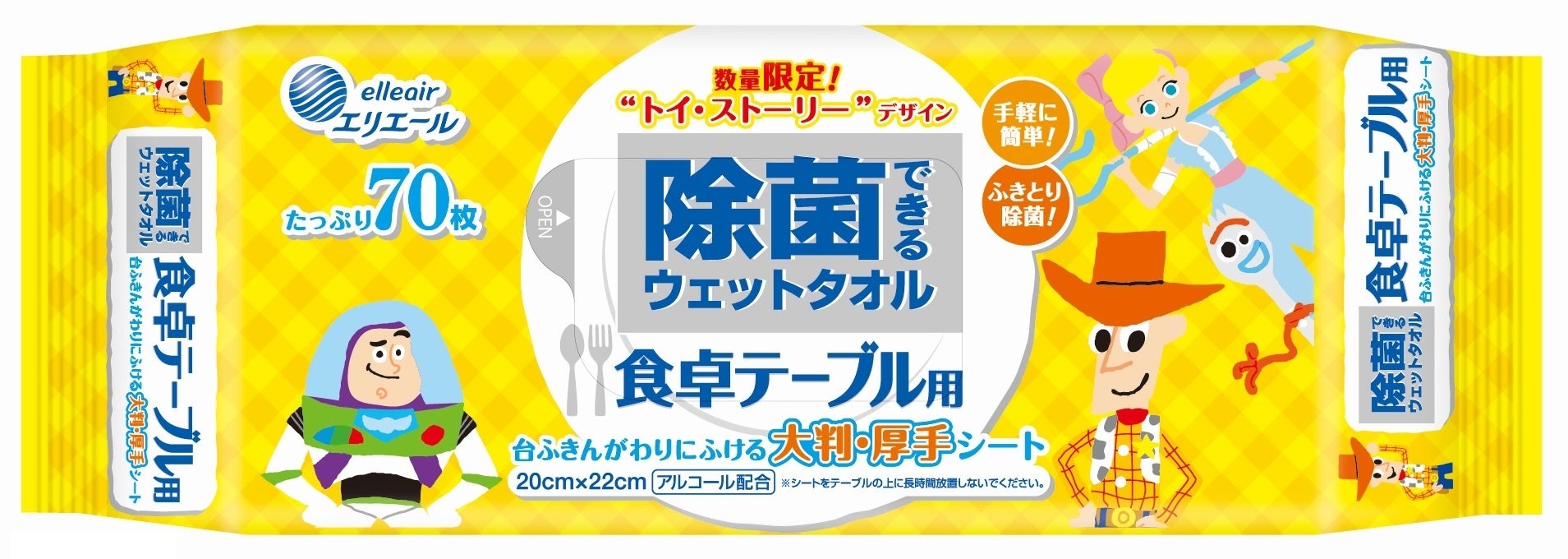雑菌が気になる台ふきんがわりに、20×22cmの大判シートで広いテーブルをしっかり拭き取る『除菌できるウエットタオル 食卓テーブル用』に『トイ・ストーリー』限定デザインが登場。テーブルクロスをイメージしたイエロー調のギンガムチェック柄に「ウッディ」と「バズ・ライトイヤー」らを手描き風イラストで可愛らしくデザインしました。食べこぼしも拭き取りやすい厚手シートはアルコール配合で、軽い油汚れもスッキリ落とし、拭いたあとはすぐに乾きます。