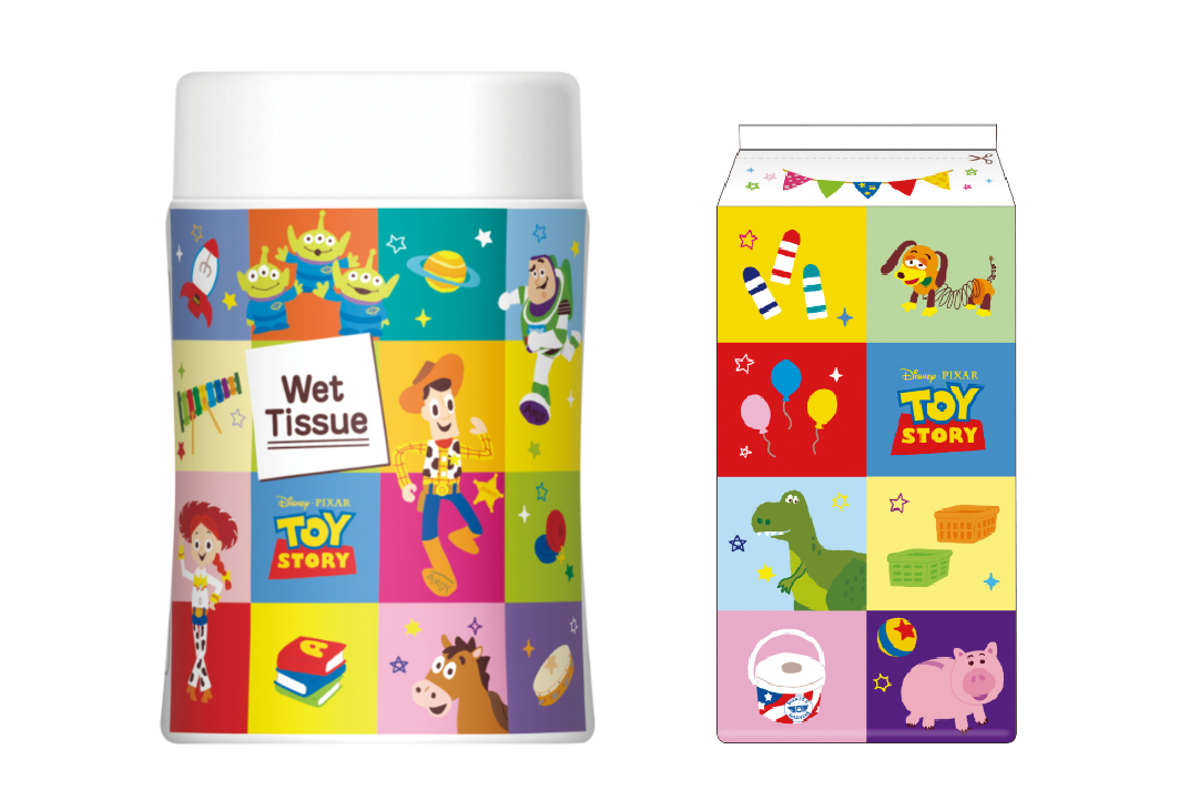 ①『エリエール 除菌できるアルコールタオル ウイルス除去用ペアパック品 ディズニーデザイン企画品』は今春、ホテルがオープンすることで話題の『トイ・ストーリー』をパッケージデザインに採用した、ご自宅で使いやすい本体(ボトルタイプ)とつめかえ用のペアパック品。ポップでカラフルなボトルはお部屋にそのまま置いてもインテリアになじみ、気分を明るくしてくれます。