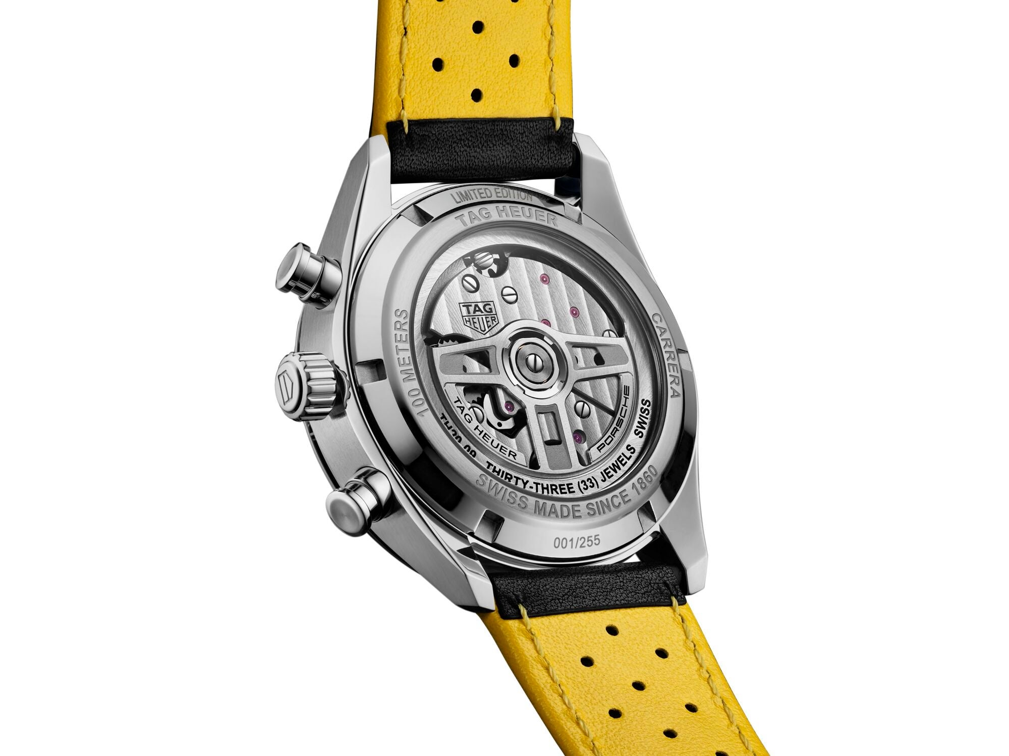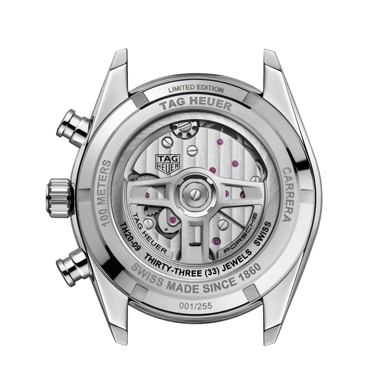 このタイムピースは、1954年のカレラ・パナメリカーナ・メヒコを制したポルシェ 550 スパイダーのカーナンバー「55」に因み、255本のリミテッドエディションとなっています。それぞれの時計のケースバックには、このタイムピースのプレミアム感を引き立てるシリアルナンバーと「LIMITED EDITION」の特別な刻印が施されています。