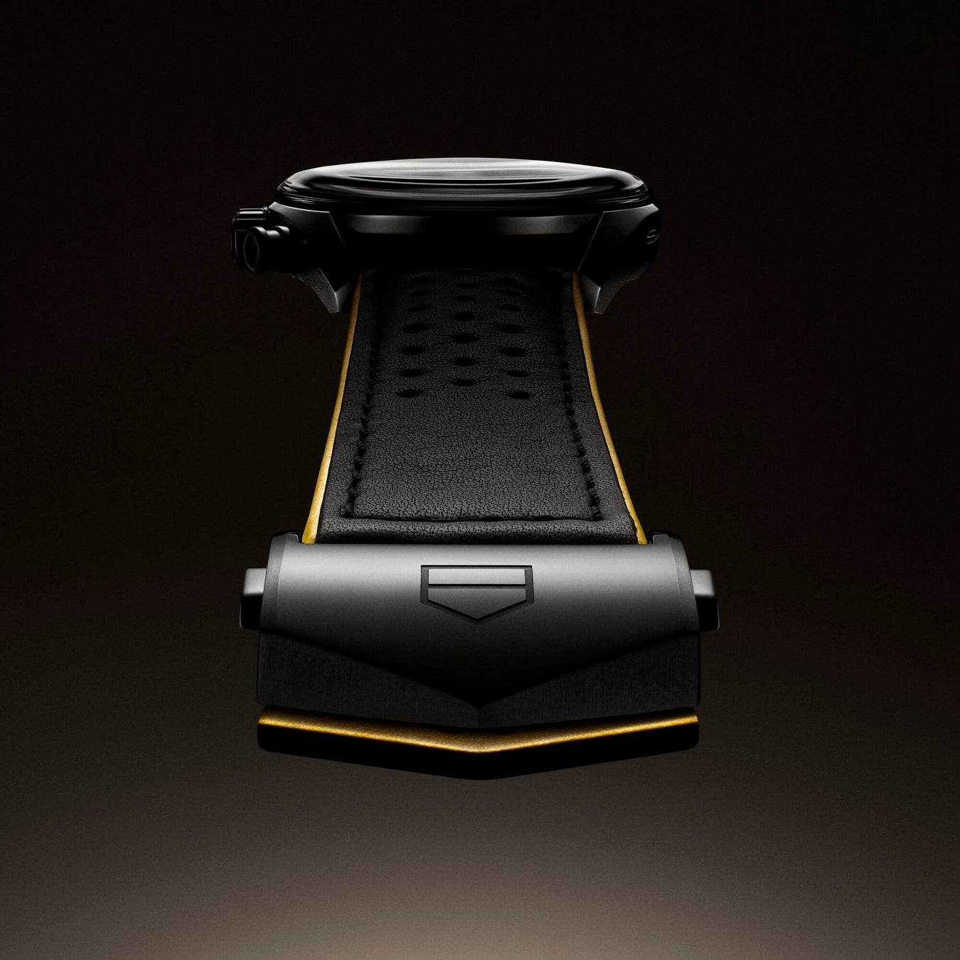 パンチング加工が施されたブラックのカーフストラップは、イエローのライニングとステッチがさりげなくスポーティさとヴィンテージ感を添え、魅力をさらに高めています。ストラップの両サイドを飾るライニングが、この時計のアスレチックな美学を引き立てる斬新なデザイン要素となっています。
