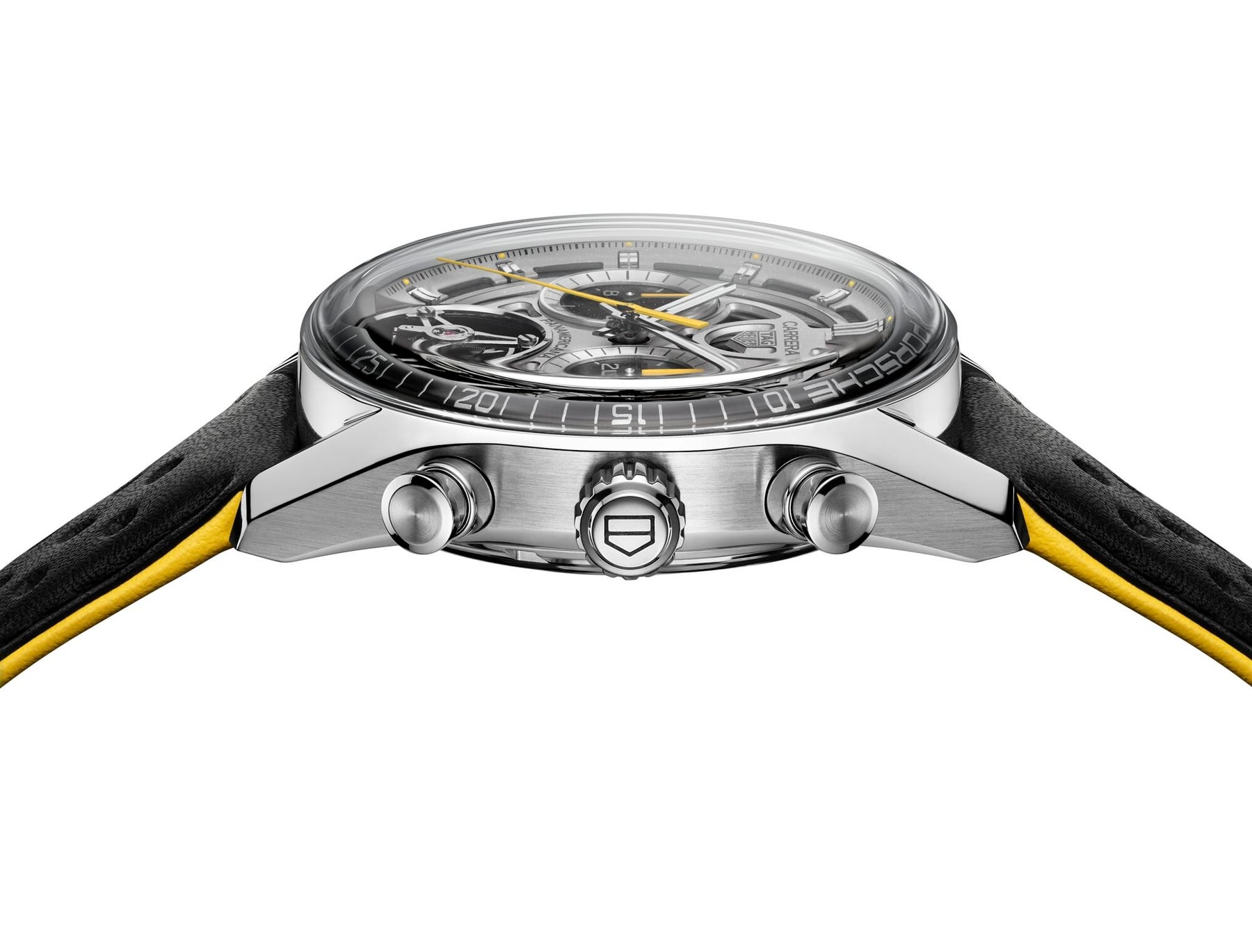 新作「タグ・ホイヤー カレラ トゥールビヨン クロノグラフ x ポルシェ パナメリカーナ」のデザインの直接のインスピレーションとなったのが、アイコニックなレーシングカー「ポルシェ 550 スパイダー」。精巧なディテールが目を引くオープンワークダイヤルが、550 スパイダーのホイールを模している一方、シルバー、イエロー、ブラックの配色は、オリジナルマシンのカラーリングをそのまま採用しています。また、イエローラッカー仕上げの針とサブダイヤルの針が、この時計に際立ったスポーツテイストを添えています。