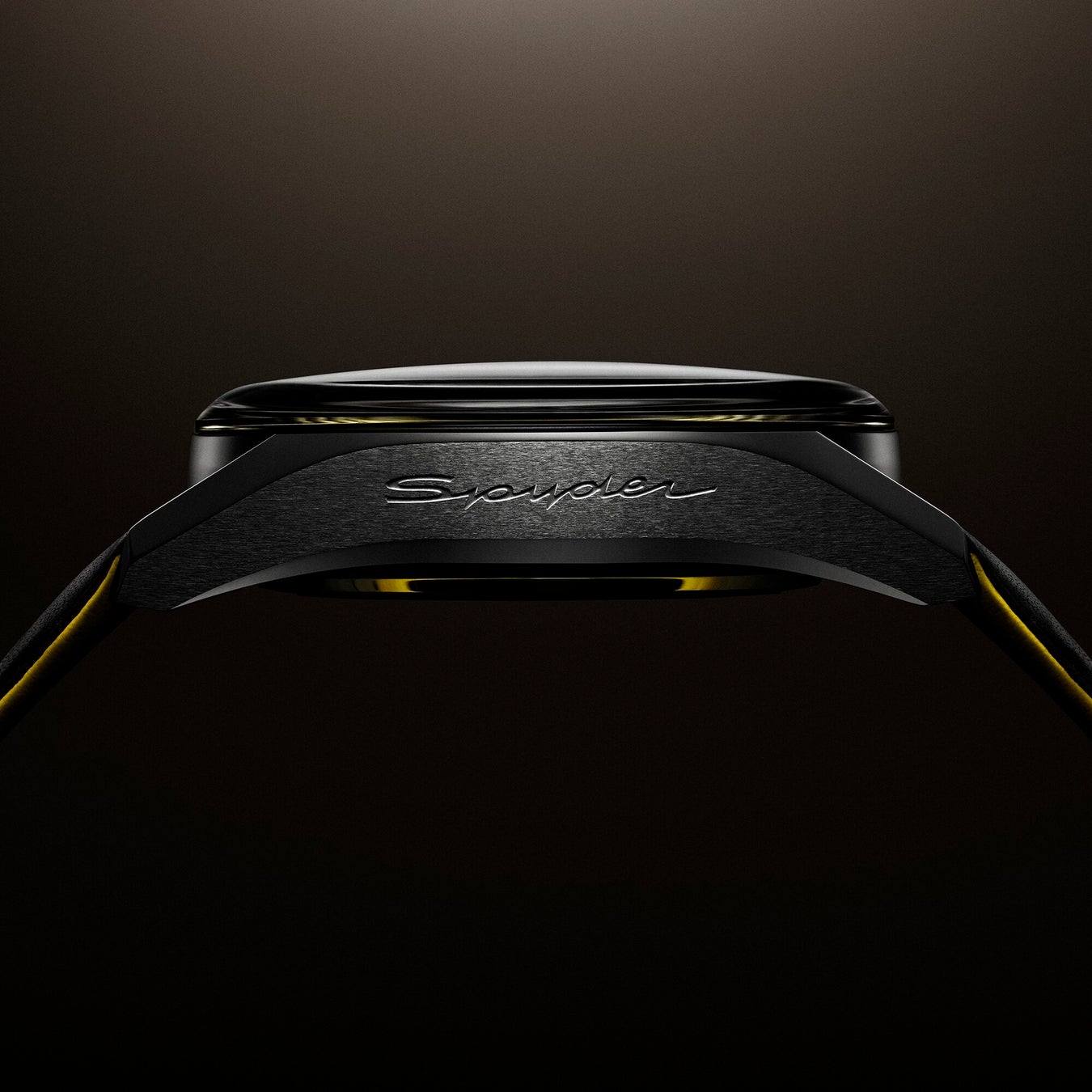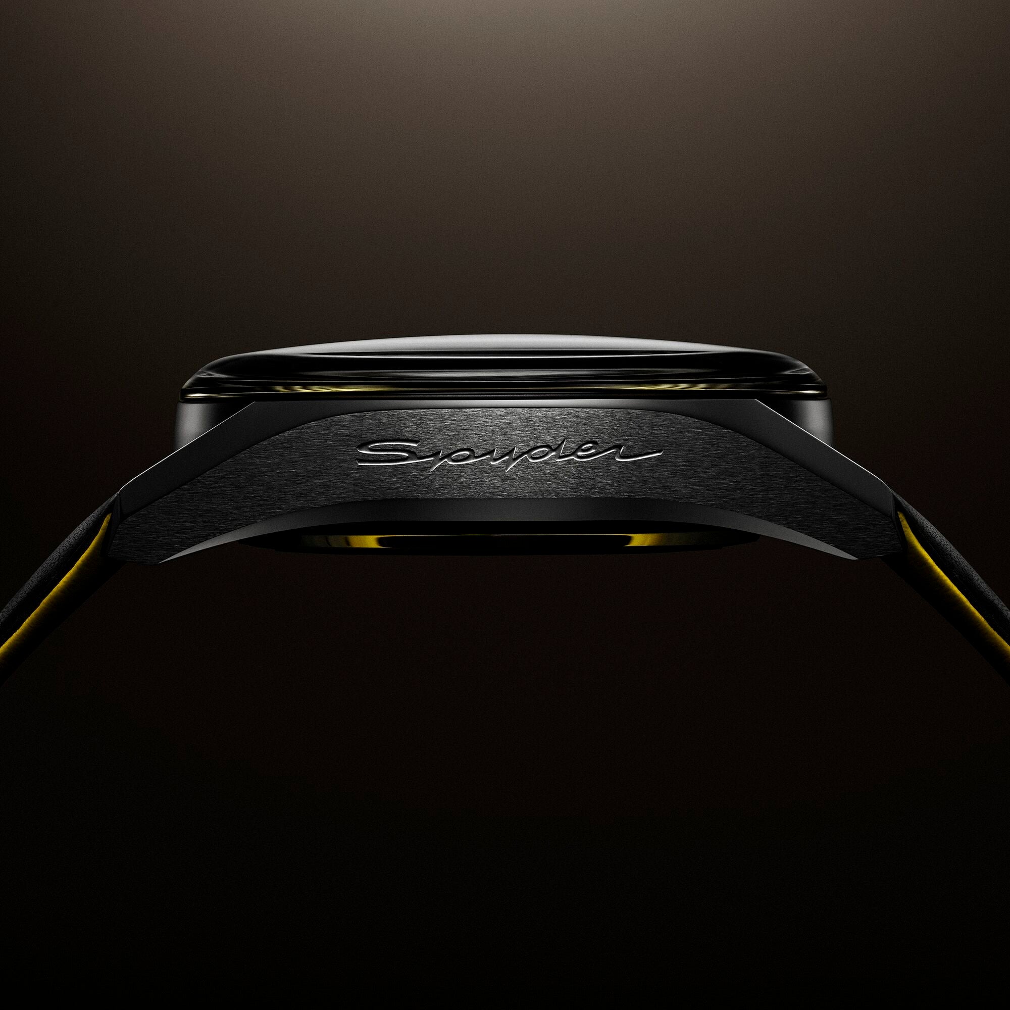 サイズは42 mm。サテン仕上げとポリッシュ仕上げが交互に施されたステンレススティール製ケースを備え、サイドには1950年代にポルシェが使用していたオリジナルフォントで「Spyder」と刻印されています。湾曲したフランジにはPORSCHE ロゴをプリントし、6時位置のトゥールビヨンの上には伝説のレース「PANAMERICANA」の名が刻まれています。