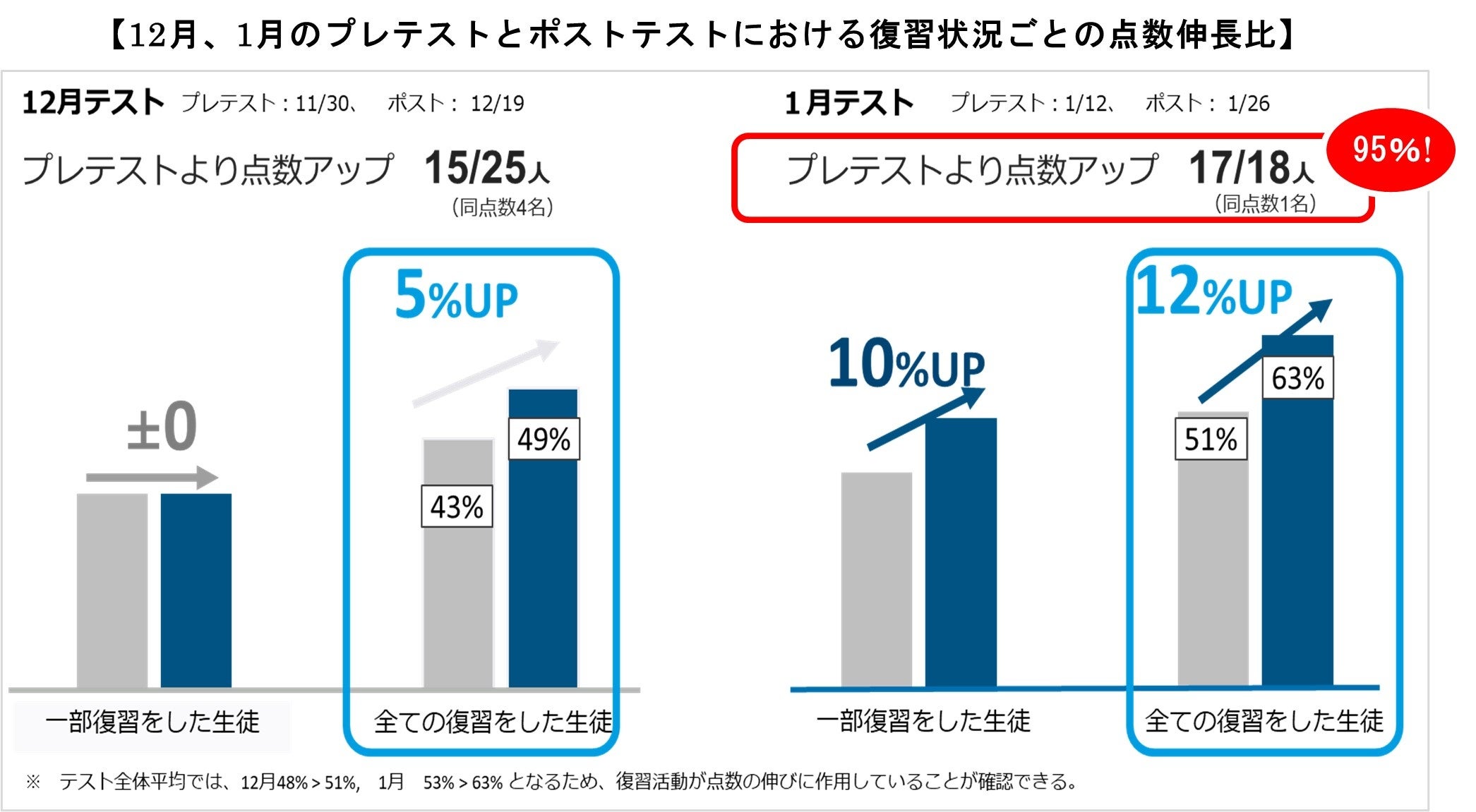 これを12月、1月の2回、単元を変えて行ったところ、12月では60%、1月は95%の生徒のテストの点数がプレテストよりアップしました。また、プレテストを元に配信した苦手箇所の課題を全て学習した生徒の方が、プレテストからの点数向上率が高いこともわかりました。