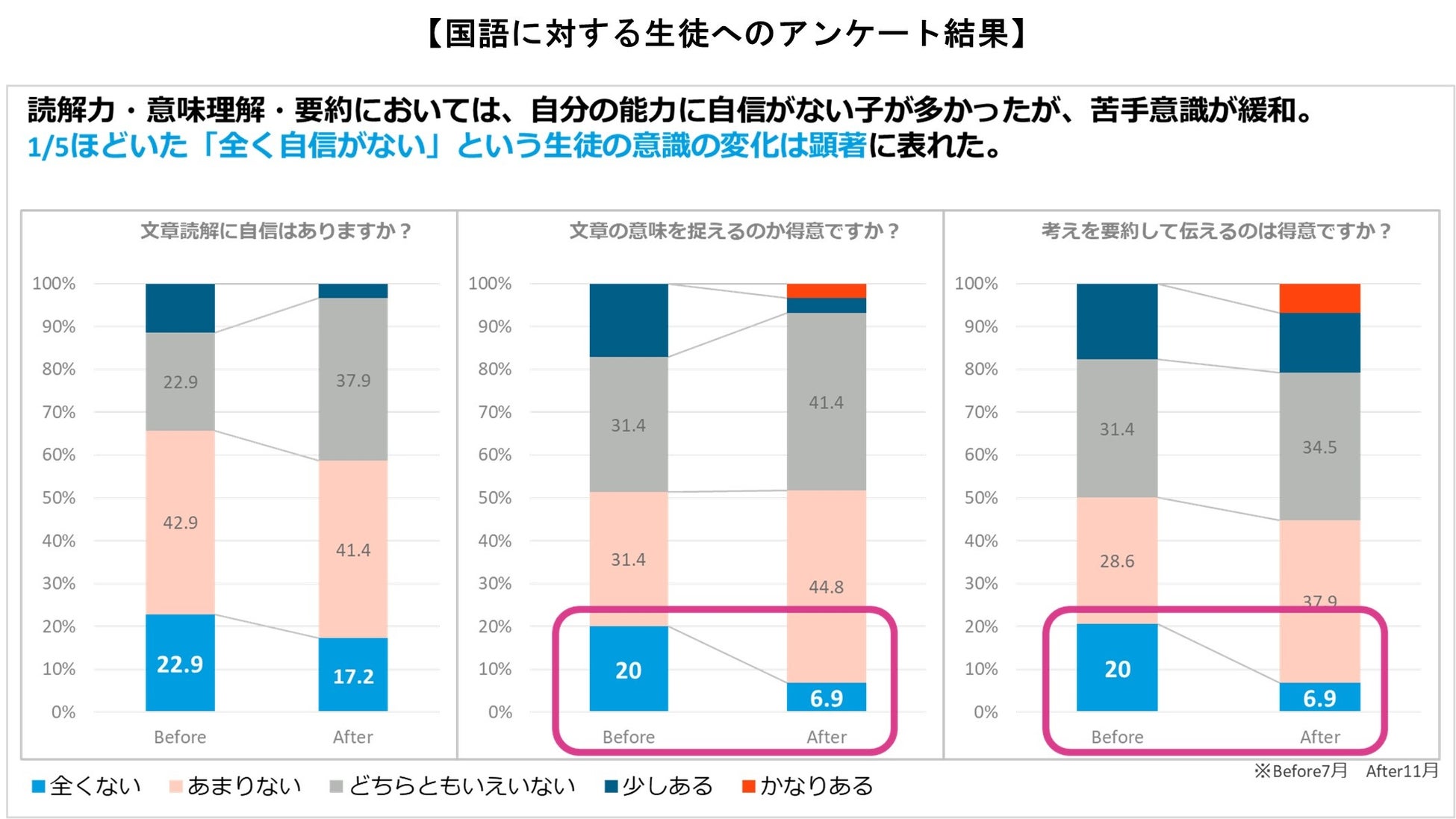 また、生徒に行ったアンケートでは、反転授業実施後は文章読解や文章の意味をとらえること、考えを要約して伝えることに対して自信が全くない、不得意と答えた生徒数がいずれも減少しました。国語科目に対する苦手意識が軽減されたことも明らかになりました。教員からは、「自己肯定感を高めることができた」、「自主学習が難しい生徒でも、自主的に課題設定しようとするようになった」など、生徒の変容に対する感想がありました。