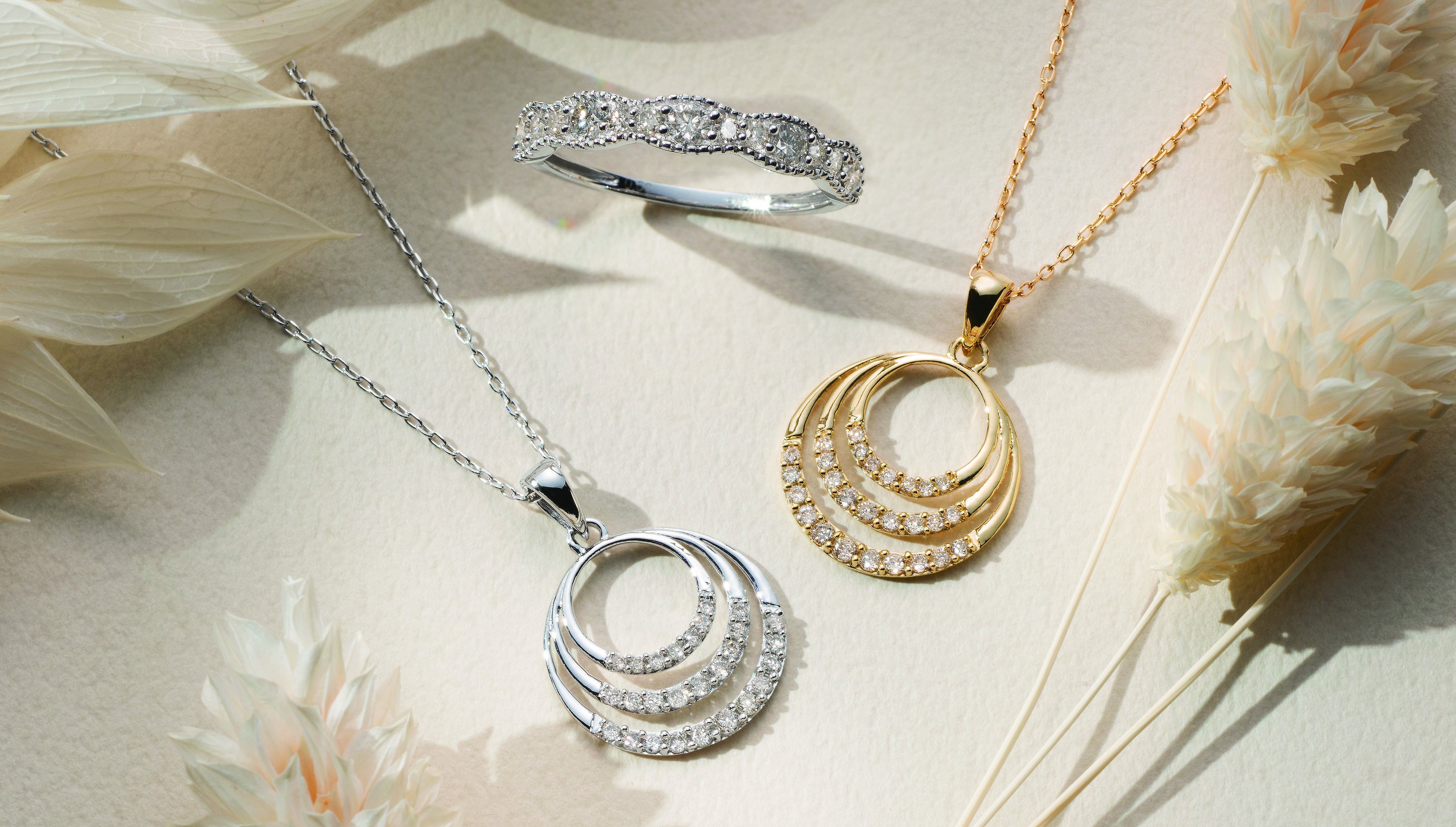です。手作業で繊細に仕上げた華やかなダイヤモンドをあしらったネックレスやリングを紹介します。