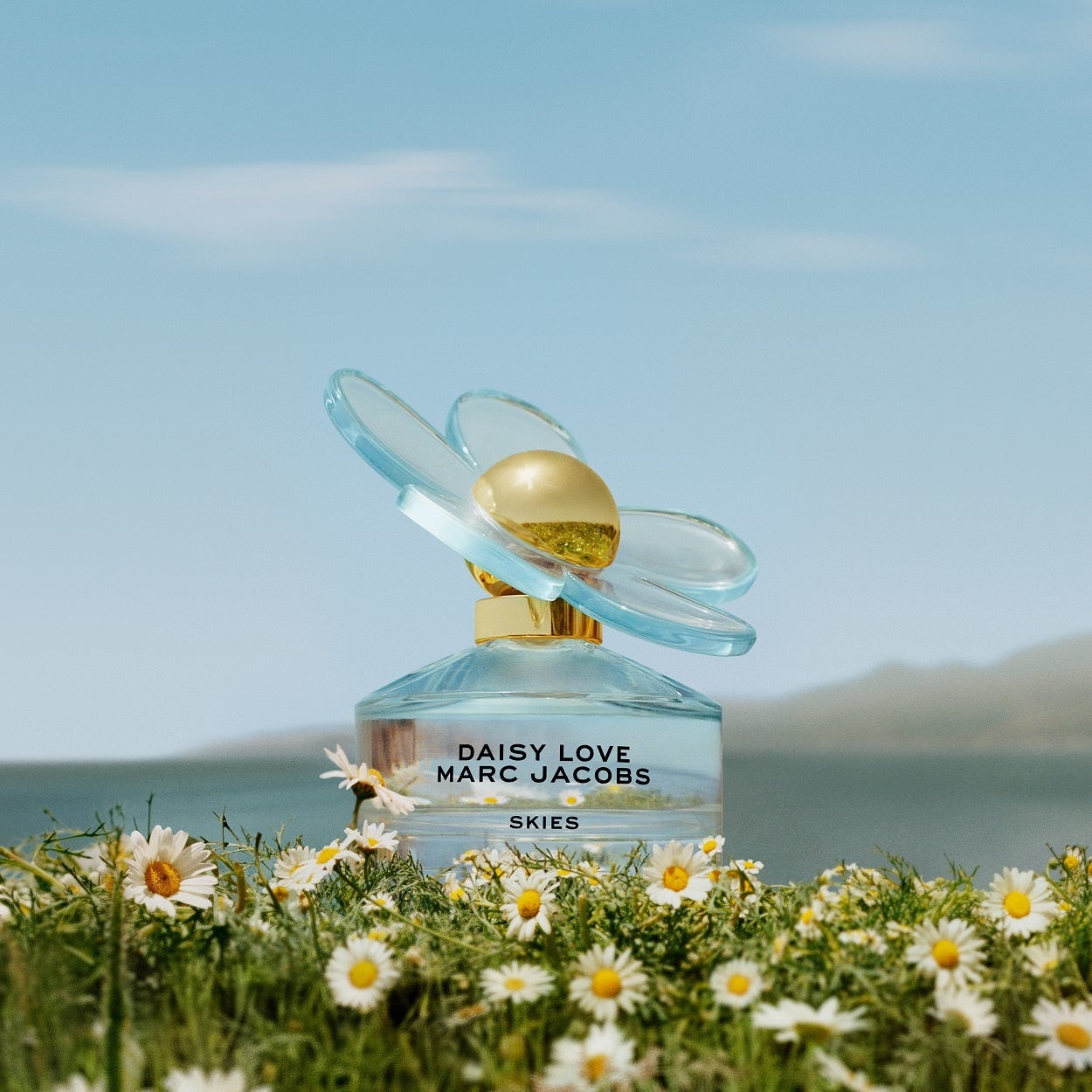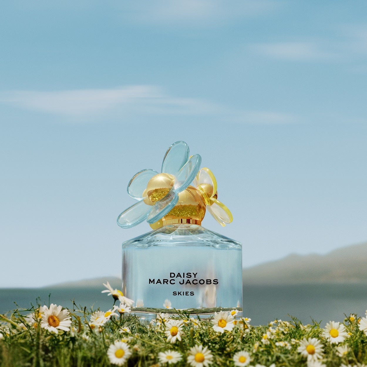 フォトグラファーのアラスデア・マクレランが撮影し、ケイティ・グランドがクリエイティブディレクションを務めたキャンペーンビジュアルは、静かな海辺の断崖に置かれた「マーク ジェイコブス デイジー スカイズ」コレクションをフィーチャーしています。太平洋に広がる真っ青な水平線をバックに、敷き詰められたデイジーフラワーの中に「デイジー スカイズ」のボトルが並んでいます。