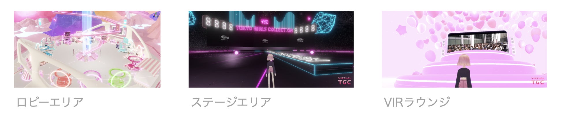 空間内はブースやSNS映えスポット、アトラクションなど様々な体験コンテンツが設置されたロビーエリア、巨大スクリーンが設置され、リアル会場のバーチャルTGC専用カメラによる独自アングル映像で、臨場感の高いスペシャルパブリックビューイング(生配信)が実施されるステージエリア、そして、空間内に隠された5つの鍵を集めると入室できるプレミアムなVIPラウンジの3つのエリアに分かれています。