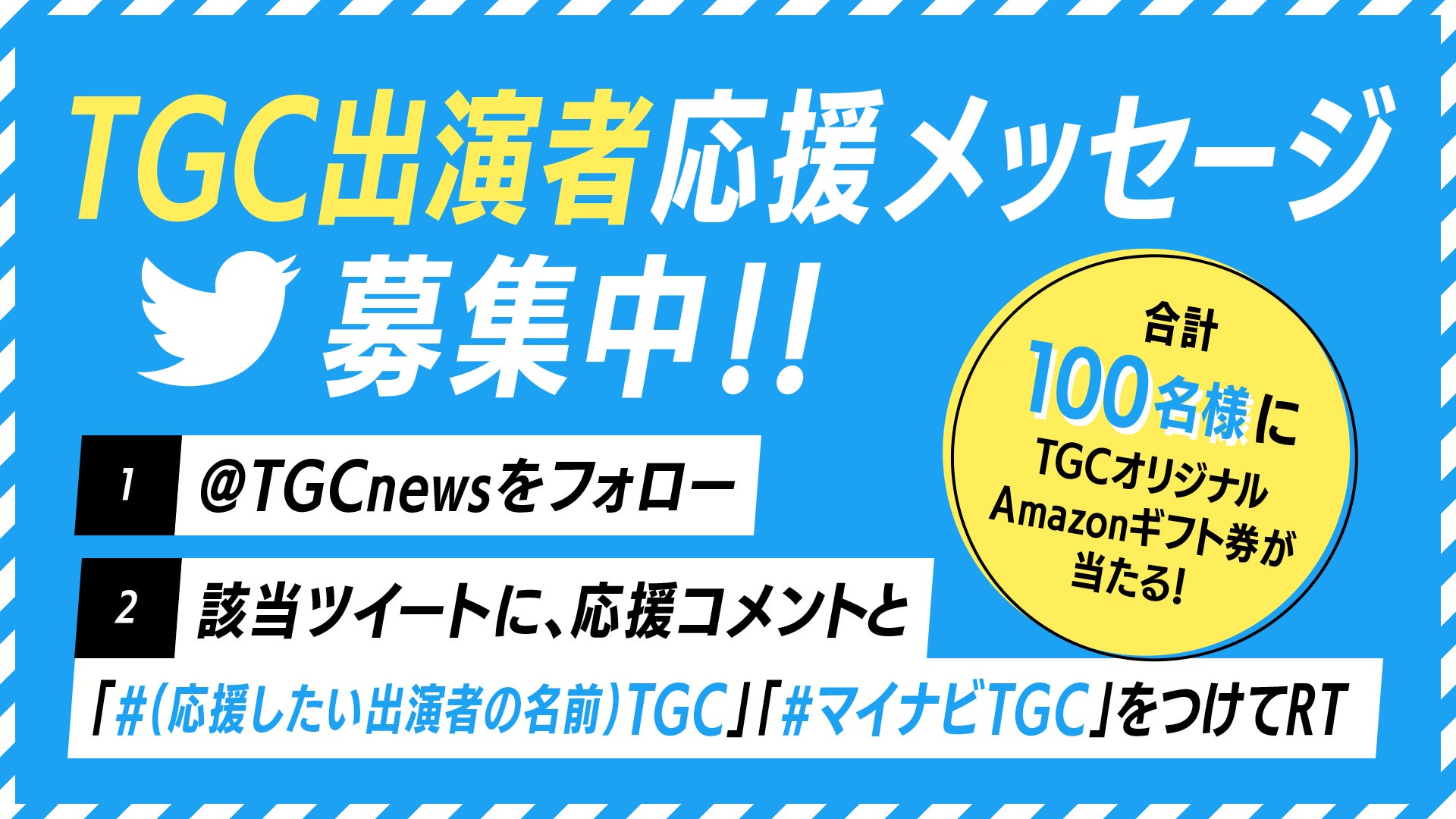 TGC出演者への応援メッセージをTwitterで大募集!TGC公式Twitterをフォローの上、企画該当ツイートに応援コメントと「#(応援したい出演者の名前)TGC」「#マイナビTGC」をつけてリツイートしてくれた方の中から抽選で合計100名様にTGCオリジナルAmazonギフト券をプレゼント!