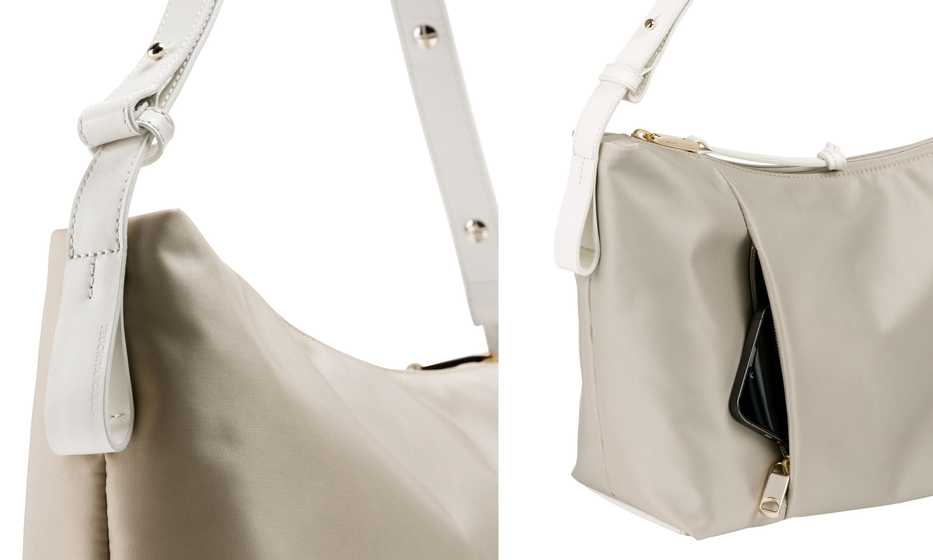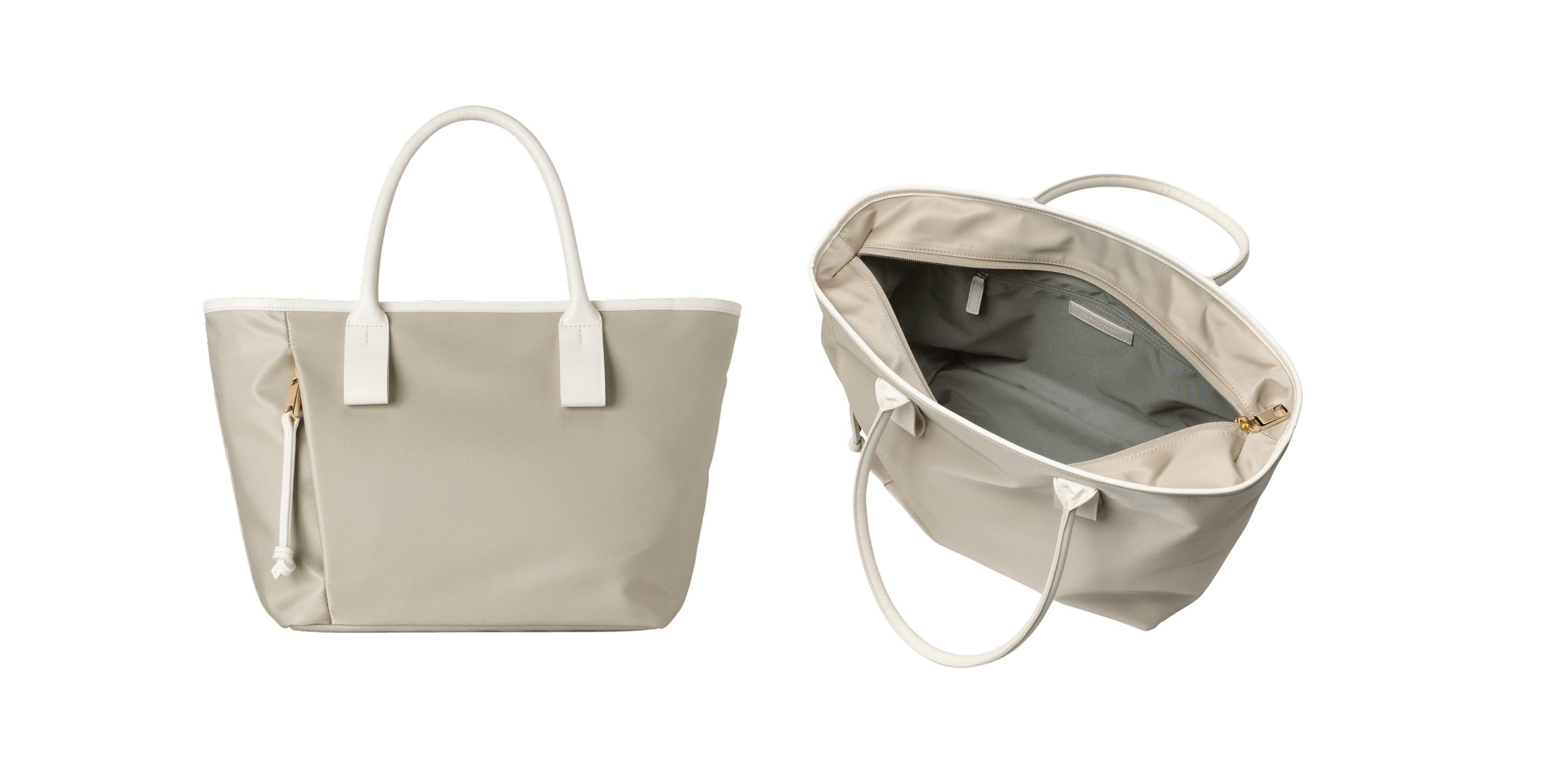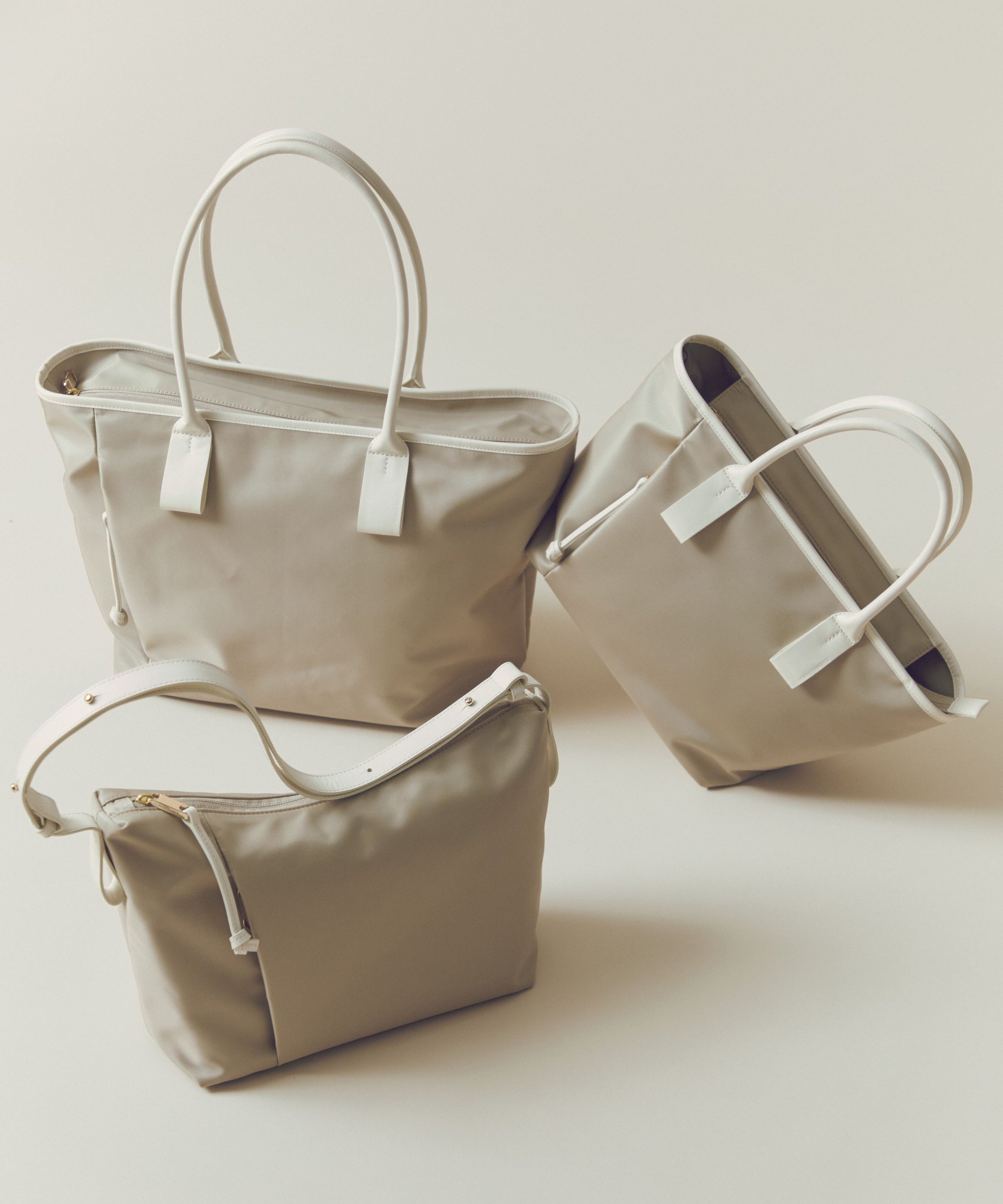 メイン素材のナイロン生地にはスタイリングに合わせやすい落ち着いたグレージュを、副素材のレザーにはノーブルな印象のオフホワイトを配色。爽やかで上品な雰囲気を纏わせました。