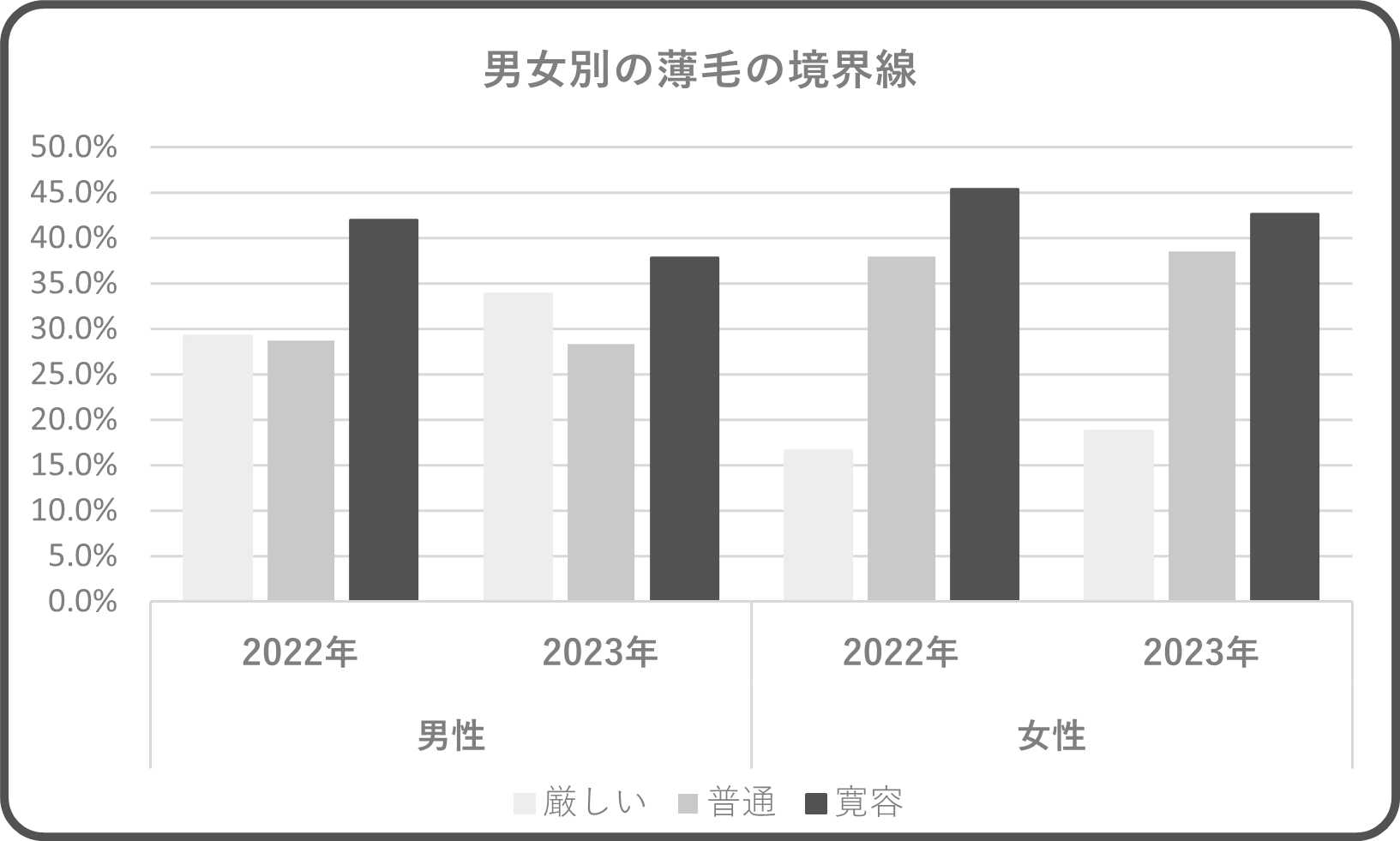 おでこの広さ(眉毛の上から生え際まで)4cm~8cmの選択肢(タイトル下のイラスト参照)の中から、4cm・5cmと回答した人を「厳しい」、7cm・8cmと回答した人を「寛容」とし、薄毛と感じる認定ライン「薄毛の境界線」(以下、境界線)について質問したところ、回答数の最も多かった境界線は「6cm」となりました。6cmは、指の本数に例えるとおよそ4本です。おでこ(眉毛の上から生え際まで)に指4本が収まる人は薄毛に認定される結果となっております。昨年の境界線は、2019年から4年連続となる「7cm」で薄毛に「寛容」でしたが、今年の調査結果から以前より、薄毛に関して厳しい目で見られていることがわかりました。全回答の境界線平均値は6.1cmとなり、前年と比較して-0.09cm※1と平均値からも厳しい境界線となっていることが分かります。