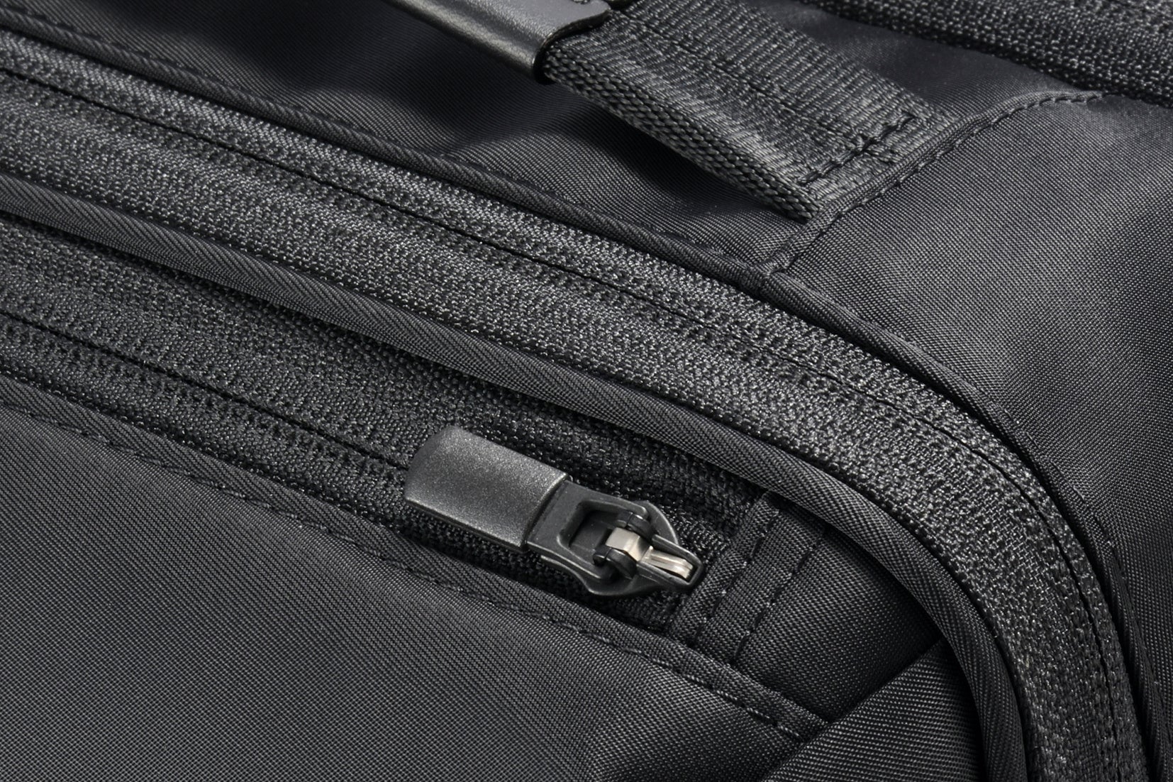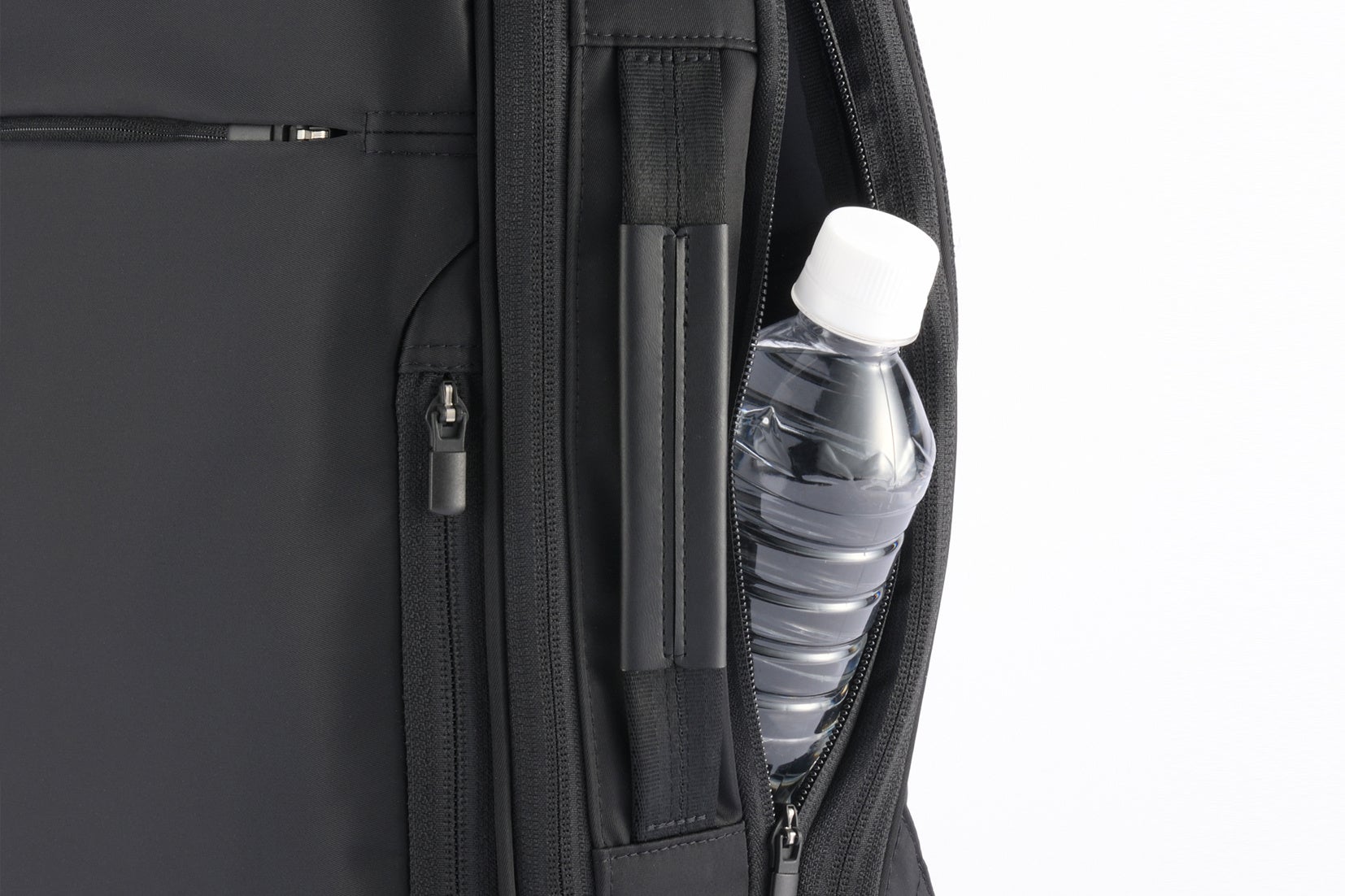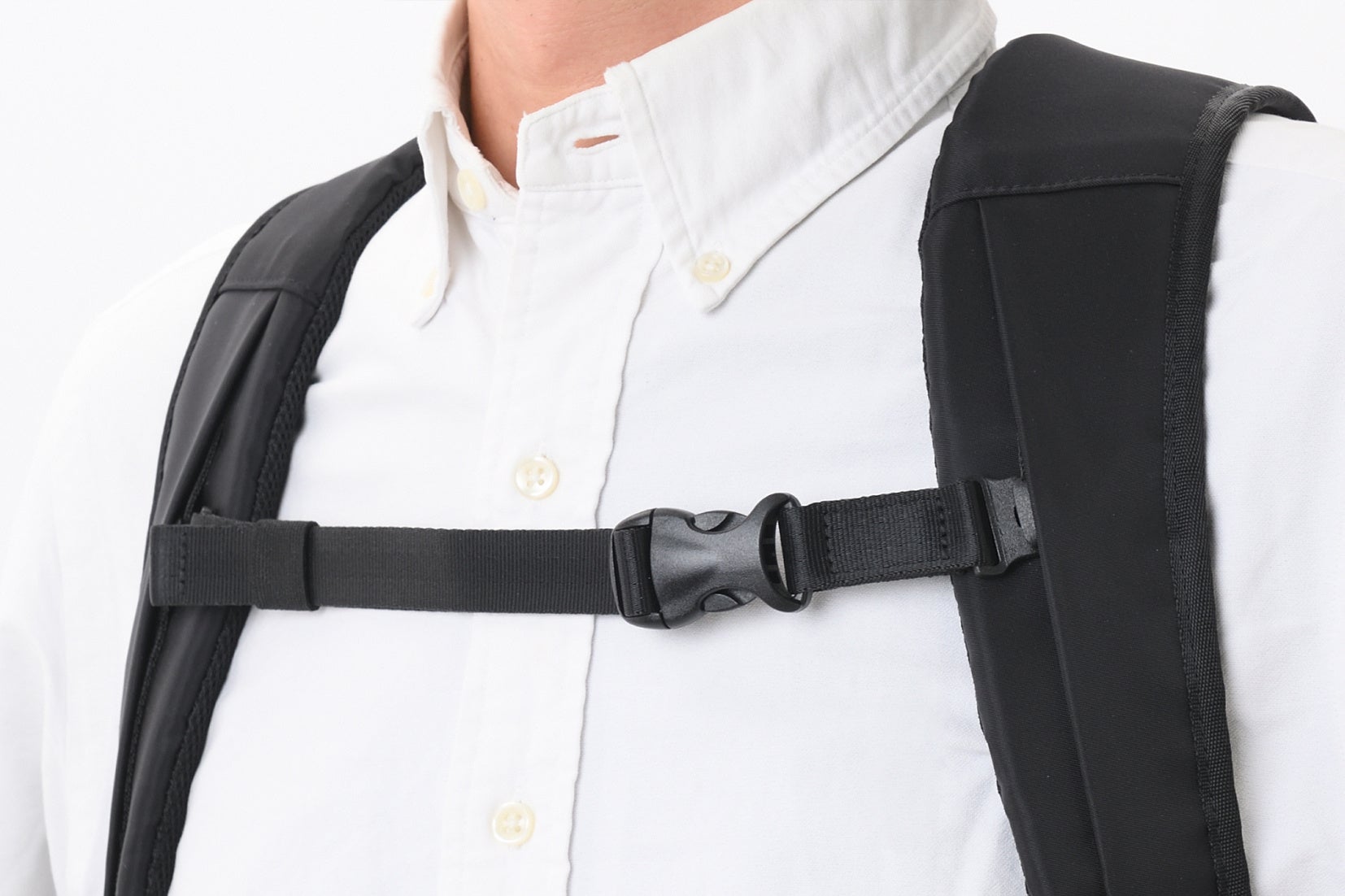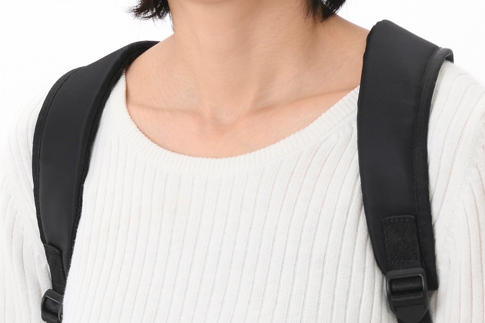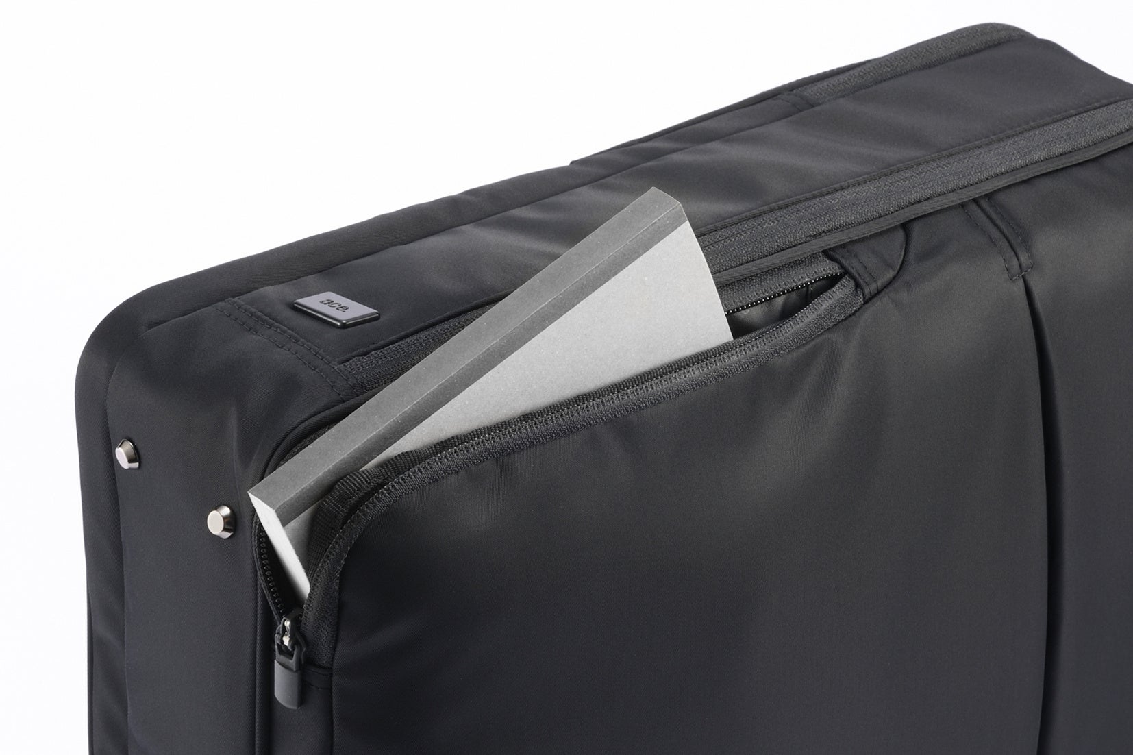 周囲だけでなく着用者にも邪魔になりにくい薄マチ形状ながら、書類やノートPC等の荷物が効率良く入る無駄のないスクエア型で容量をしっかりと確保しています。