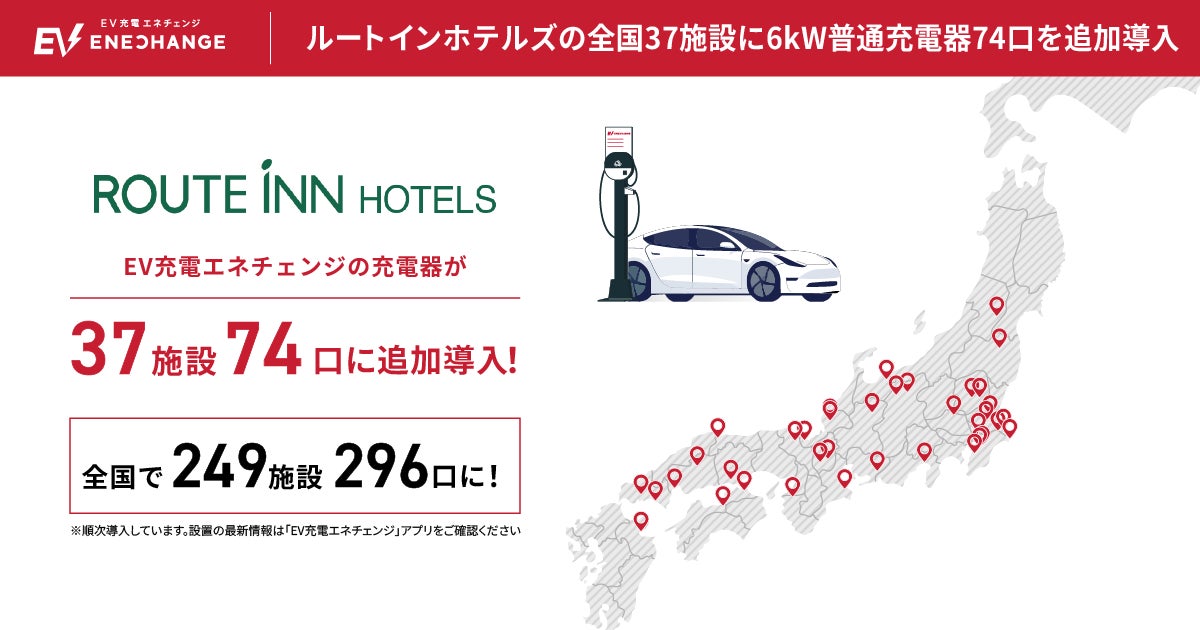 ENECHANGE(エネチェンジ)株式会社(本社:東京都中央区、代表取締役CEO:丸岡 智也)は、ルートインジャパン株式会社(本社:東京都品川区、代表取締役:永山 泰樹)が運営する「ルートインホテルズ」全国37施設に各2口、計74口の6kWの普通充電器「EV充電エネチェンジ」を導入したことをお知らせします。これまでの設置と合わせて※1 「ルートインホテルズ」への6kW普通充電器「EV充電エネチェンジ」の設置は249施設296口となりました。また、追加設置した充電器は3月5日より運用を開始いたします。