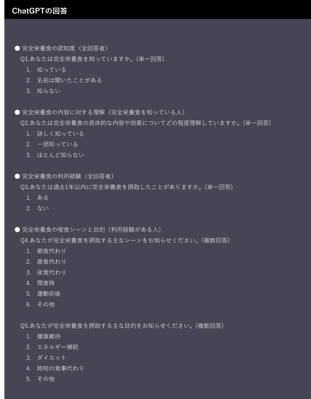 「完全栄養食」をテーマとするアンケート調査を、ChatGPT作成ver.とリサーチャー作成ver.で同時に実施。調査結果や質はどれぐらい異なるのか?