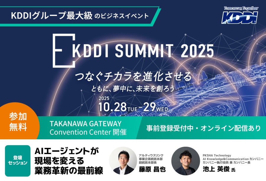 アルティウスリンク株式会社(所在地:東京都渋谷区、代表取締役社長:那谷 雅敏、以下 アルティウスリンク)は、2025年10月28日(火)・29日(水)にTAKANAWA GATEWAY Convention Center会場とオンライン配信のハイブリッド形式で開催されるビジネスイベント「KDDI SUMMIT 2025」に登壇します。